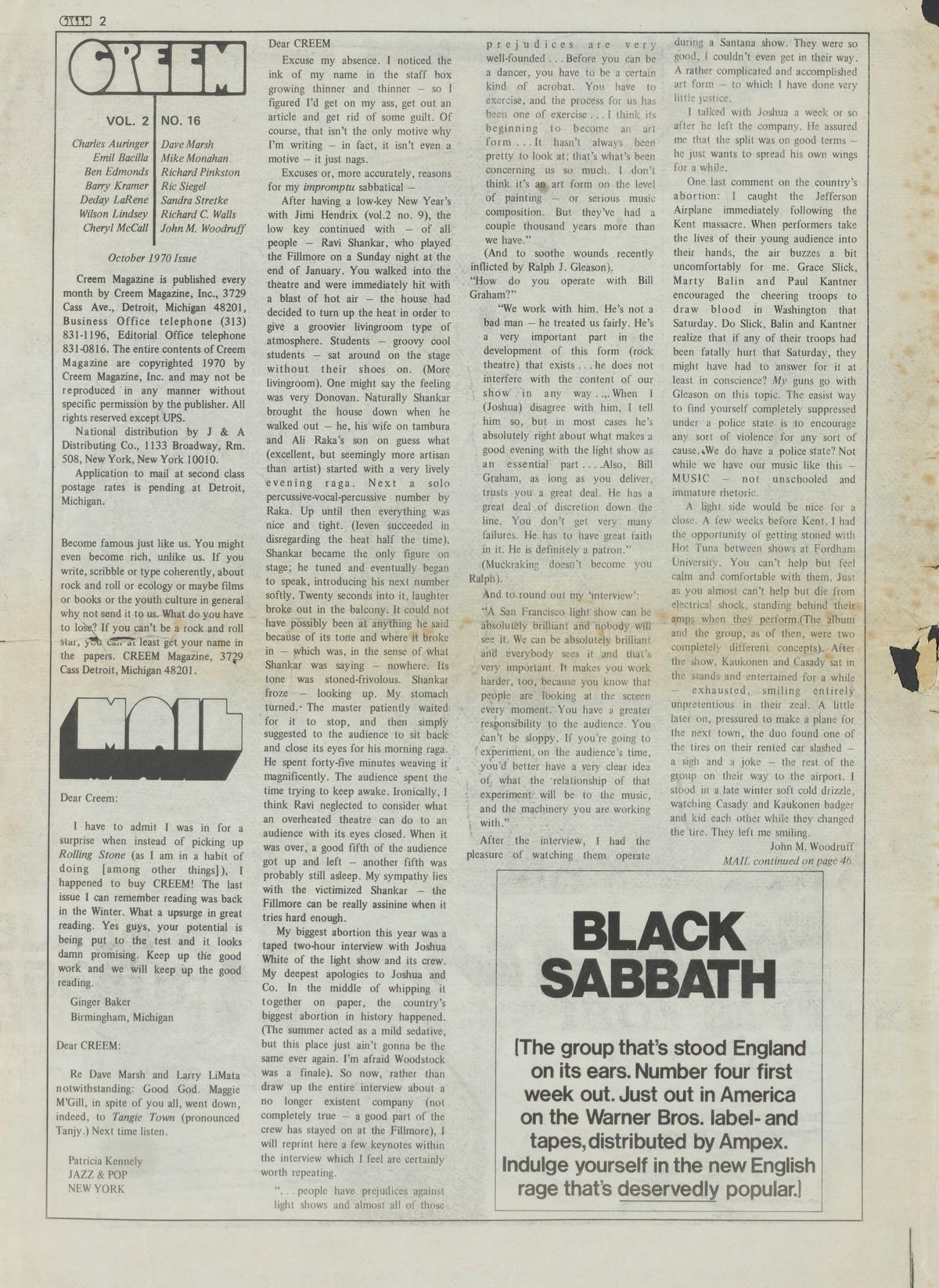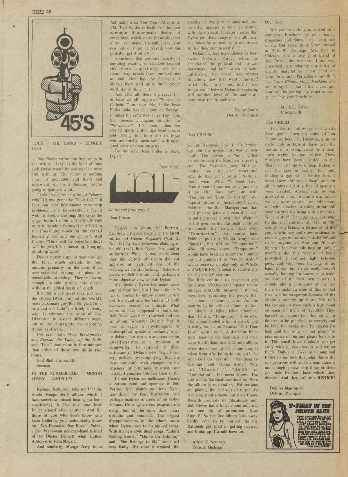 Dear Creem: I have to admit I was in for a surprise when instead of picking up Rolling Stone (as I am in a habit of doing [among other things]), I happened to buy CREEM! The last issue I can remember reading was back in the Winter. What a upsurge in great reading.