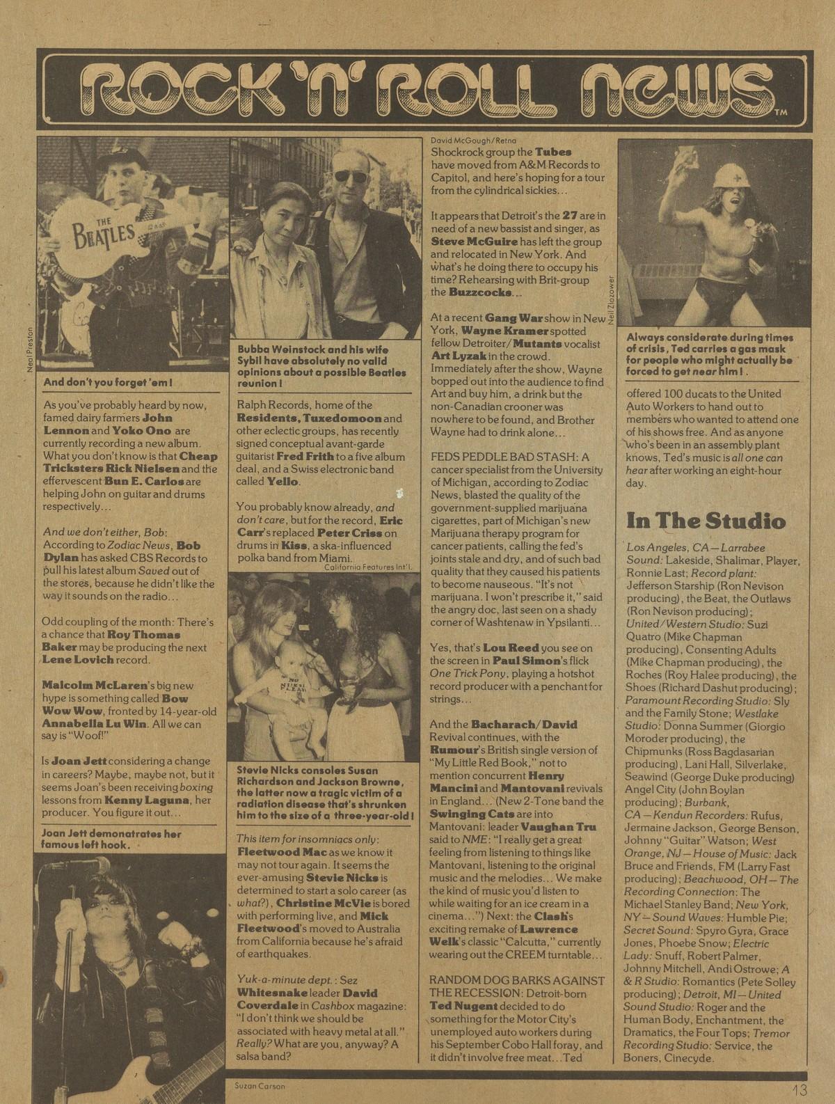 As you’ve probably heard by now, famed dairy farmers John Lennon and Yoko Ono are currently recording a new album. What you don’t know is that Cheap Tricksters Rick Nielsen and the effervescent Bun E. Carlos are helping John on guitar and drums respectively...
