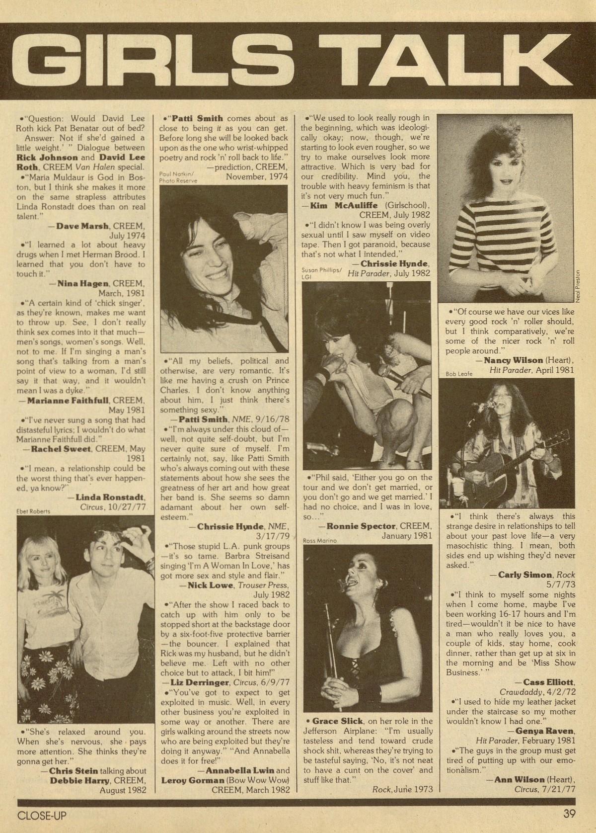 • Why Pat Benatar dresses mean: “Everyone’s first reaction was either to pick me up or pat me on the head like a five-year old.” —Glamour, June, 1982 • “If you can’t get yourself a girl, a guitar makes a wonderful substitute. Take it from a guy who knows.”