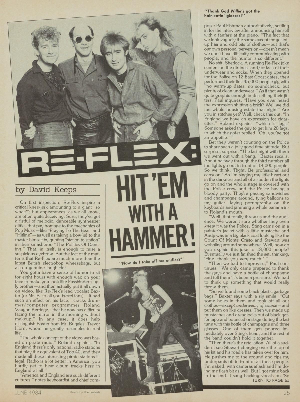 On first inspection, Re-Flex inspire a critical knee-jerk amounting to a giant “so what?”; but appearances, as we all know, are often quite deceiving. Sure, they’ve got a fistful of melodic, danceable synthesizer ditties that pay homage to the mechanics of Pop Music—like “Praying To The Beat” and “Hitline”—as well as taking a bow(ie) to the master himself by quoting “station to station” in their smasheroo “The Politics Of Dancing.”