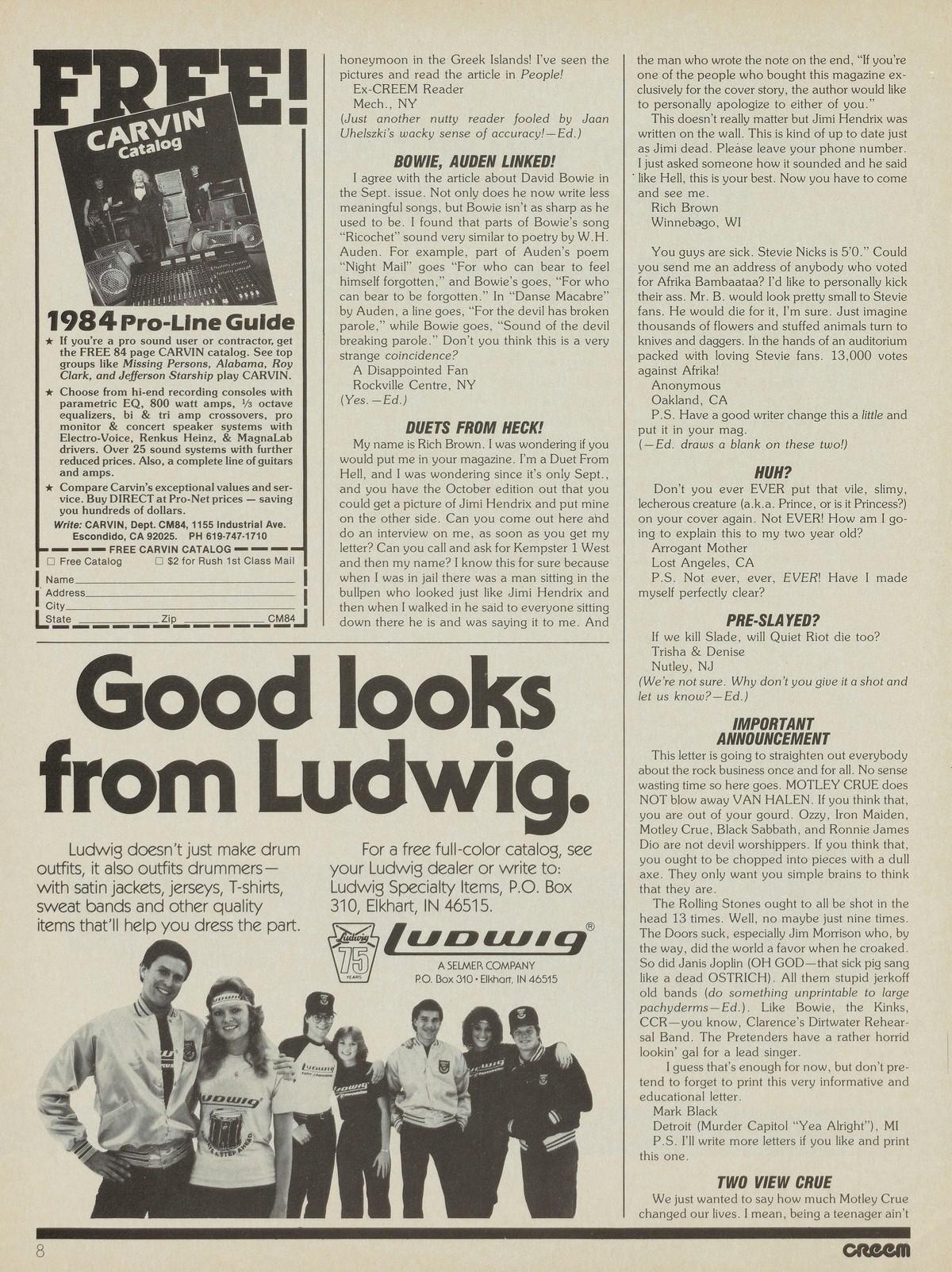 With regard to the article “Prince Of Minneapolis” (CREEM, Sept. ’84), writer Greg Linder tells us he was mistaken about the origin of the name “Coon Rapids” (a Minneapolis suburb). The writer sincerely apologizes to anyone he may have offended. The community’s name historically refers to raccoons and not, as was implied, to black settlers.