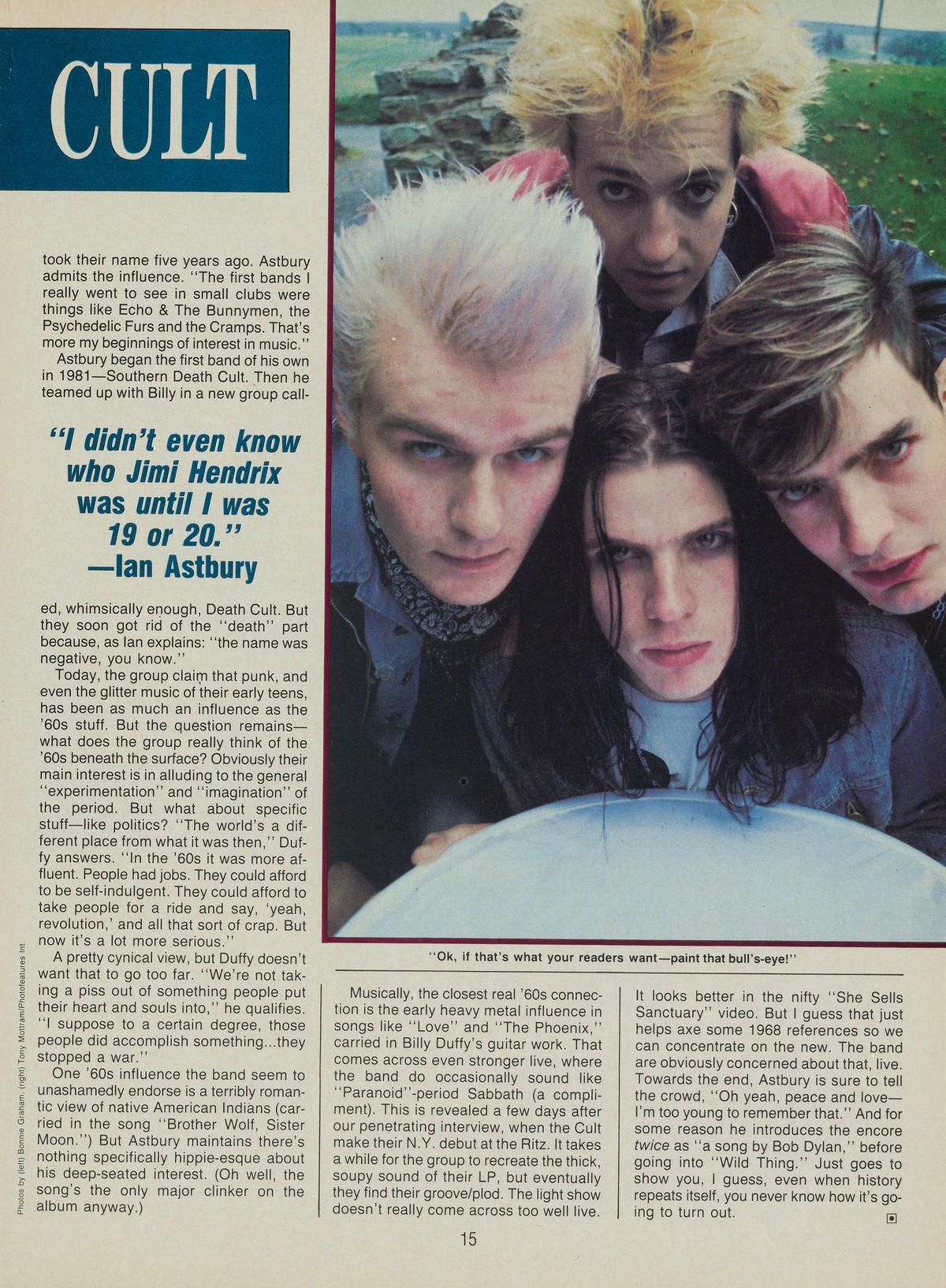 Take for example, the Cult—a good new British band who’ve regurgitated more than their fair share of psychedelic surfaces. Yet beneath their long hair, love beads, light show, groovy song titles and the mystical cover of their first U.S. LP, Love, they’re just an everyday bunch of 1986 kids. “We’re not out to revitalize the ’60s and say, ‘OK, everybody’s got to wear the gear and get all the lights and drop acid,”’ explains lead belter Ian Astbury, brushing back his neo-long hair. “We’re just saying there were some positive elements from that period which we’ve been influenced by.”