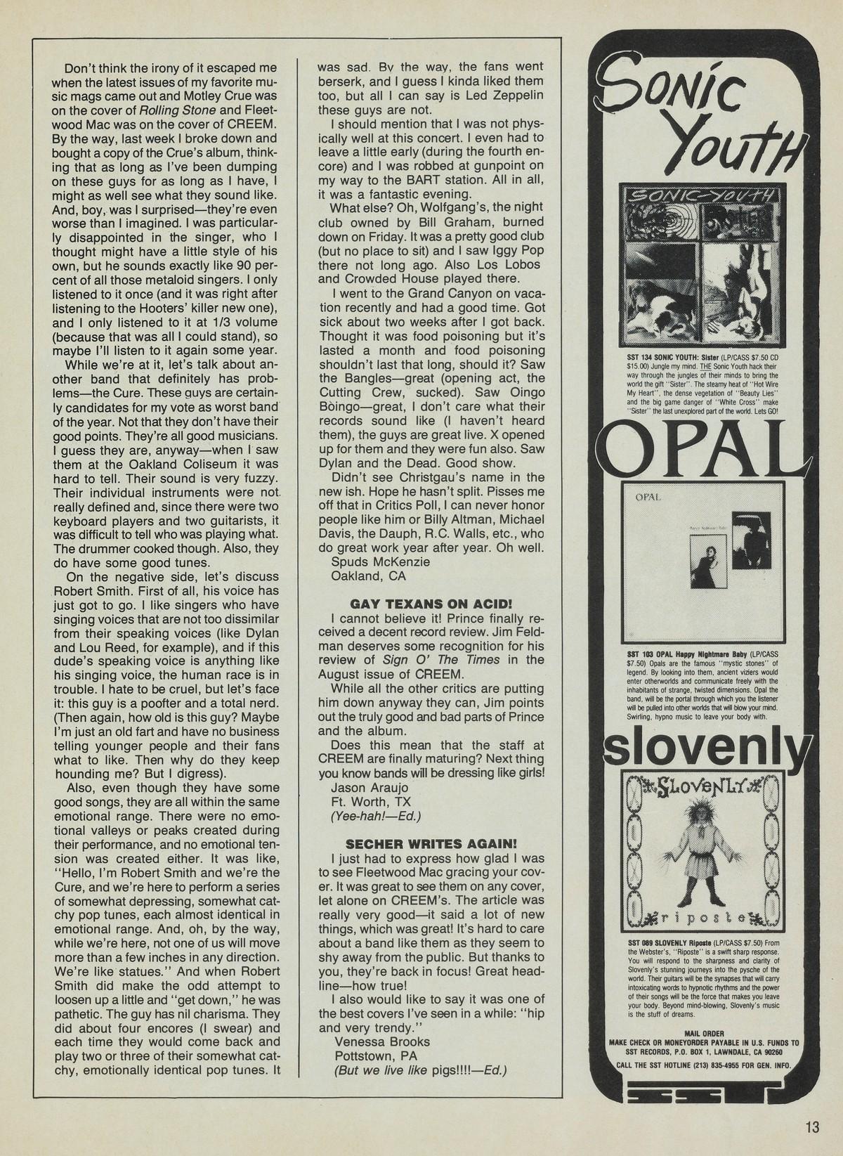 Dear Sirs: Please send me a copy of your guidelines. B. Platt APO, NY (No.—Ed.) LA LA LA LA LA BAMBA! Upon seeing September 1987’s issue of CREEM, I was pleased that Squeeze was finally getting some well-deserved attention. However, after reading Ivan Lababamba’s schizophrenic article on them, they’d probably be better off without that article.