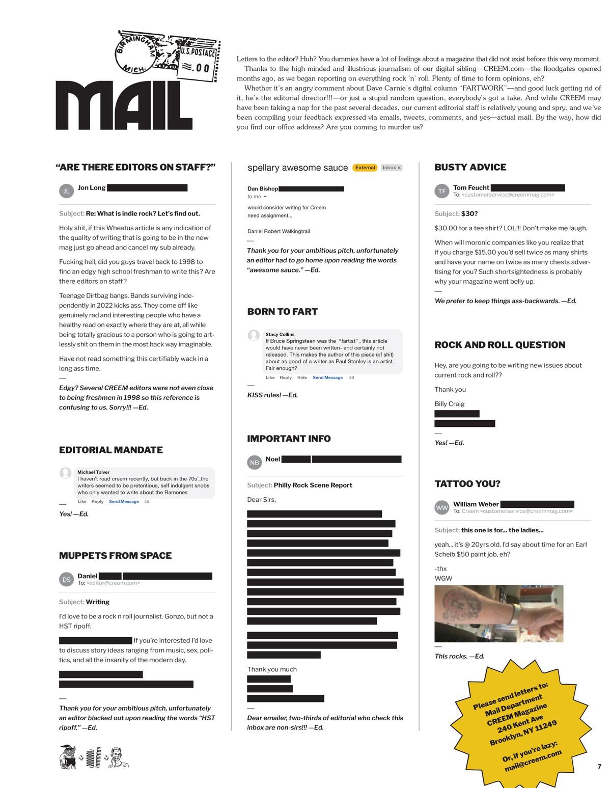 Whether it’s an angry comment about Dave Carnie’s digital column “FARTWORK”—and good luck getting rid of it, he’s the editorial director!!!—or just a stupid random question, everybody’s got a take. And while CREEM may have been taking a nap for the past several decades, our current editorial staff is relatively young and spry, and we’ve been compiling your feedback expressed via emails, tweets, comments, and yes—actual mail. By the way, how did you find our office address? Are you coming to murder us?