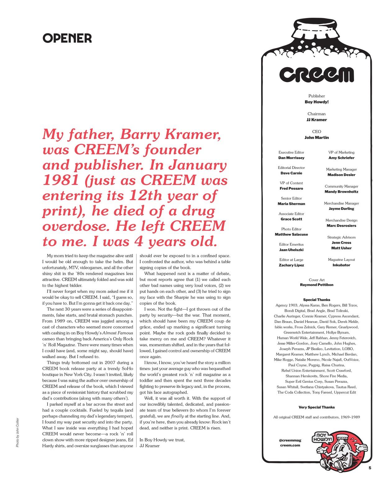 My father, Barry Kramer, was CREEM’s founder and publisher. In January 1981 (just as CREEM was entering its 12th year of print), he died of a drug overdose. He left CREEM to me. I was 4 years old.
