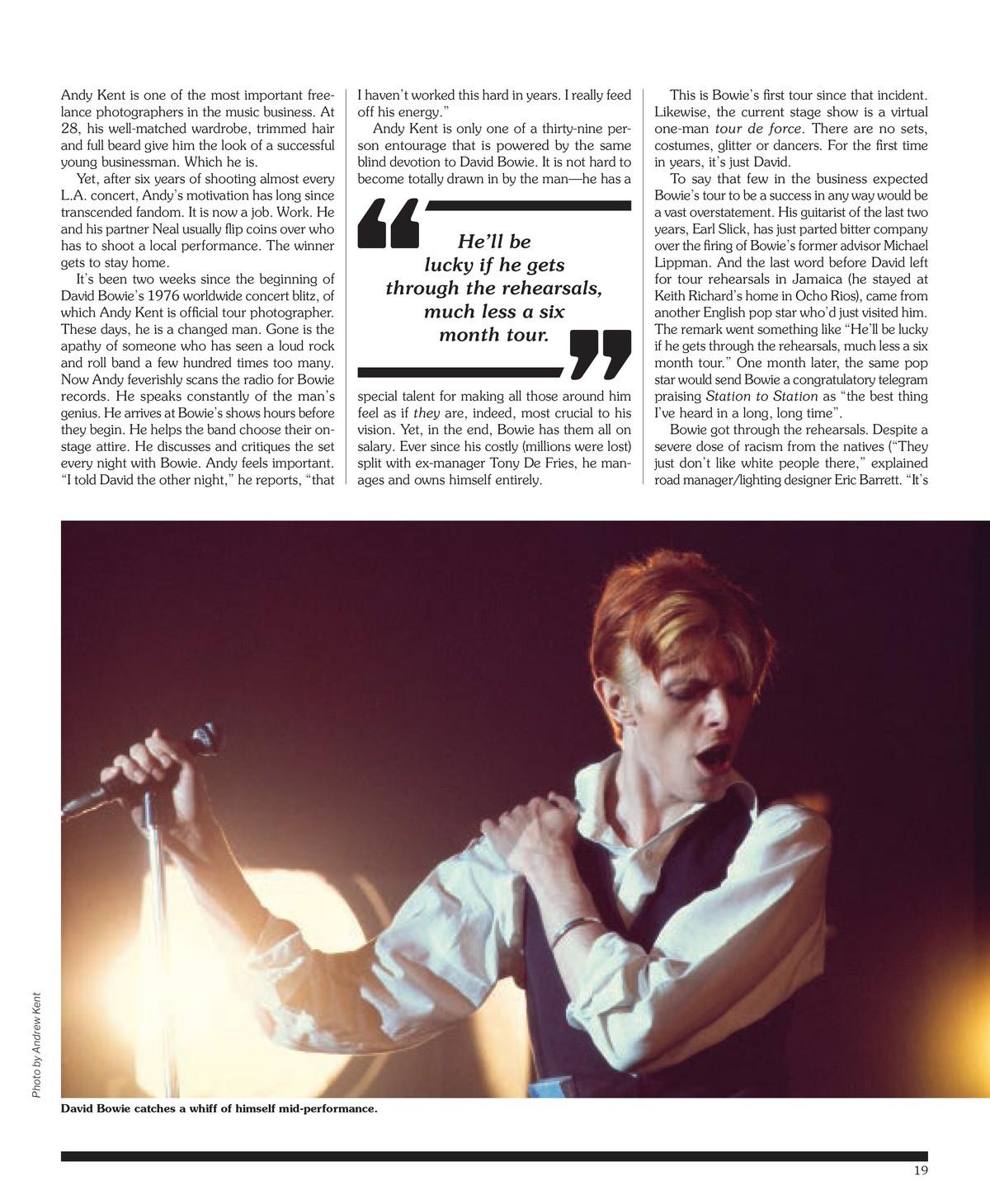 It’s been two weeks since the beginning of David Bowie’s 1976 worldwide concert blitz, of which Andy Kent is official tour photographer. These days, he is a changed man. Gone is the apathy of someone who has seen a loud rock and roll band a few hundred times too many. Now Andy feverishly scans the radio for Bowie records. He speaks constantly of the man’s genius. He arrives at Bowie’s shows hours before they begin. He helps the band choose their onstage attire. He discusses and critiques the set every night with Bowie. Andy feels important. “I told David the other night,” he reports, “that I haven’t worked this hard in years. I really feed off his energy.”