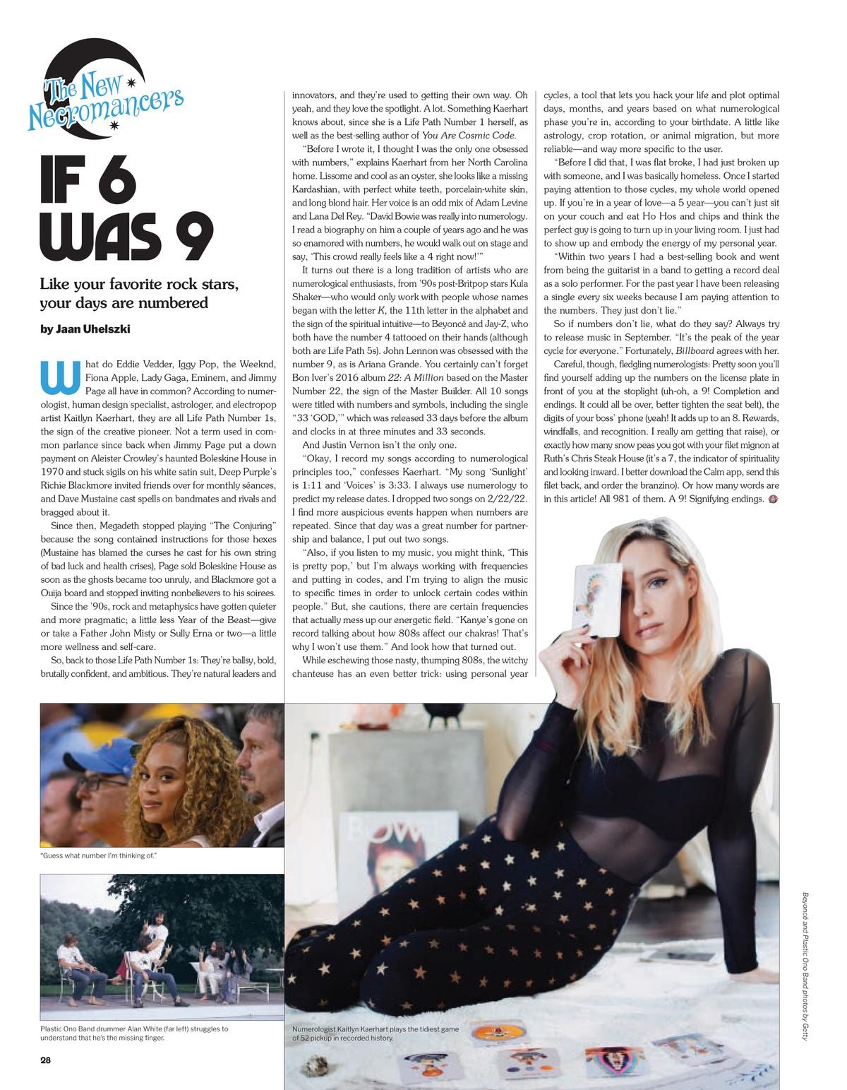 What do Eddie Vedder, Iggy Pop, the Weeknd, Fiona Apple, Lady Gaga, Eminem, and Jimmy Page all have in common? According to numerologist, human design specialist, astrologer, and electropop artist Kaitlyn Kaerhart, they are all Life Path Number 1s, the sign of the creative pioneer. Not a term used in common parlance since back when Jimmy Page put a down payment on Aleister Crowley’s haunted Boleskine House in 1970 and stuck sigils on his white satin suit, Deep Purple’s Richie Blackmore invited friends over for monthly seances, and Dave Mustaine cast spells on bandmates and rivals and bragged about it.