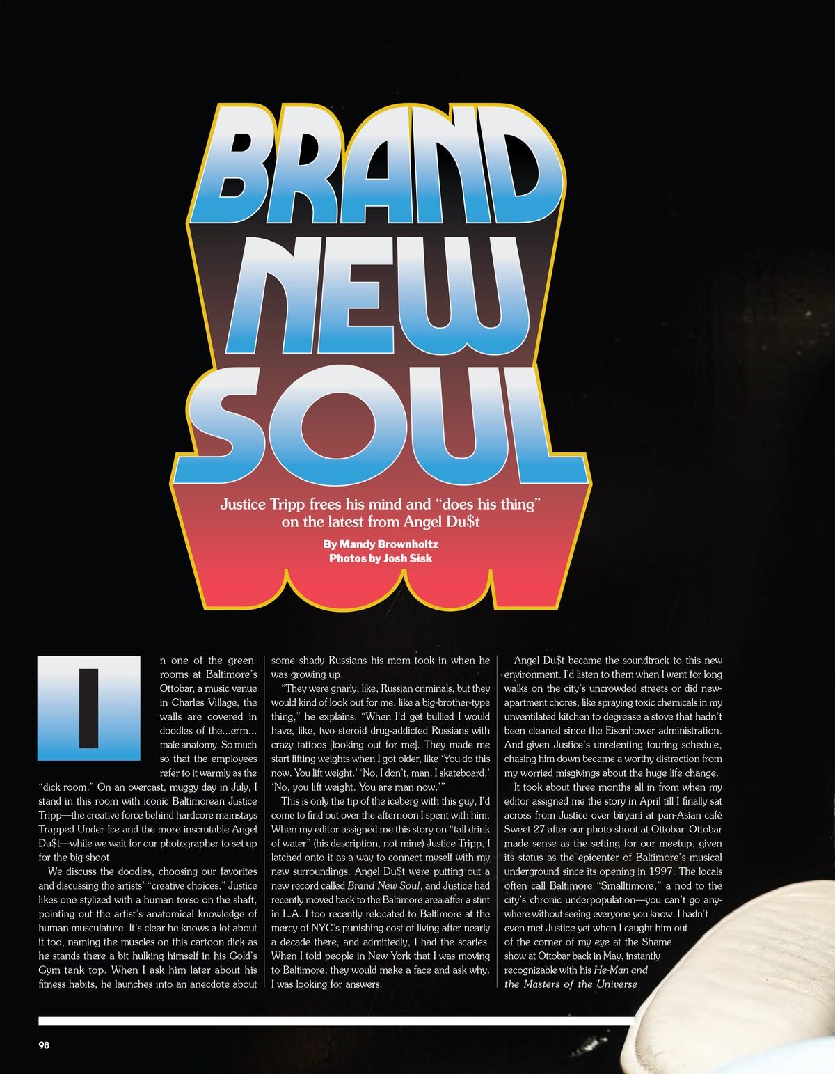 On one of the greenrooms at Baltimore’s Ottobar, a music venue in Charles Village, the walls are covered in doodles of the...erm... male anatomy. So much so that the employees refer to it warmly as the “dick room.” On an overcast, muggy day in July, I stand in this room with iconic Baltimorean Justice Tripp—the creative force behind hardcore mainstays Trapped Under Ice and the more inscrutable Angel Du$t—while we wait for our photographer to set up for the big shoot.