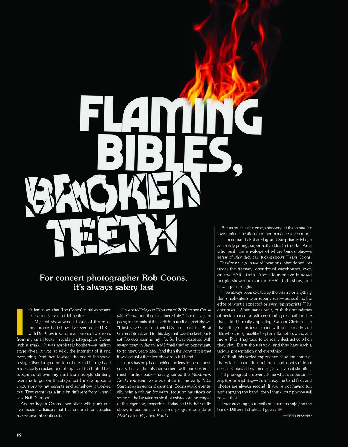 “My first show was still one of the most memorable, best shows I’ve ever seen—D.R.I. with Dr. Know in Cincinnati, around two hours from my small town,” recalls photographer Coons with a smirk. “It was absolutely bonkers—a million stage dives. It was so wild, the intensity of it and everything. And then towards the end of the show, a stage diver jumped on top of me and hit my head and actually cracked one of my front teeth off. I had footprints all over my shirt from people climbing over me to get on the stage, but I made up some crazy story to my parents and somehow it worked out. That night was a little bit different from when I saw Neil Diamond.”