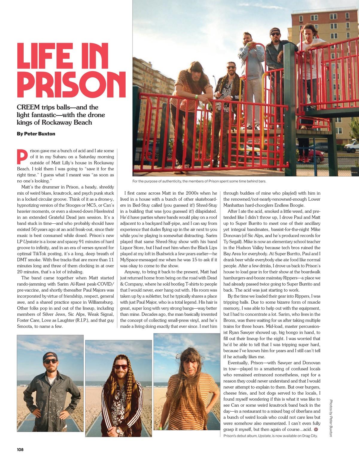 Matt’s the drummer in Prison, a heady, shreddy mix of weird blues, krautrock, and psych punk stuck in a locked circular groove. Think of it as a drone-y, hypnotizing version of the Stooges or MC5, or Can’s heavier moments, or even a slowed-down Hawkwind in an extended Grateful Dead jam session. It’s a band stuck in time—and who probably should have existed 50 years ago at an acid freak-out, since their music is best consumed while dosed. Prison’s new LP Upstate is a loose and spacey 91 minutes of hard groove to infinity, and in an era of verses synced for optimal TikTok posting, it’s a long, deep breath of DMT smoke. With five tracks that are more than 11 minutes long and three of them clocking in at over 20 minutes, that’s a lot of inhaling.