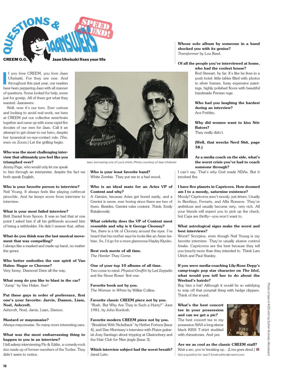 If you love CREEM, you love Jaan Uhelszki. For they are one. And throughout this past year, our readers have been peppering Jaan with all manner of questions. Some looked for help, some just for gossip. All of them got what they wanted: Jaanswers.