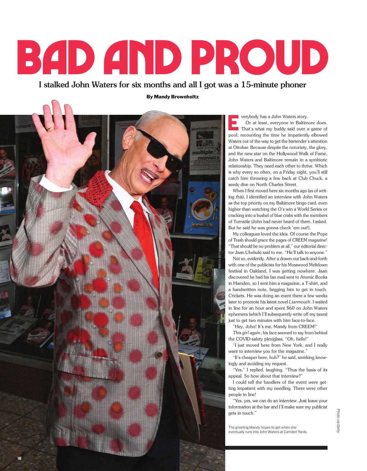 When I first moved here six months ago (as of writing this), I identified an interview with John Waters as the top priority on my Baltimore bingo card, even higher than watching the O’s win a World Series or cracking into a bushel of blue crabs with the members of Turnstile (John had never heard of them. I asked. But he said he was gonna check ’em out!).