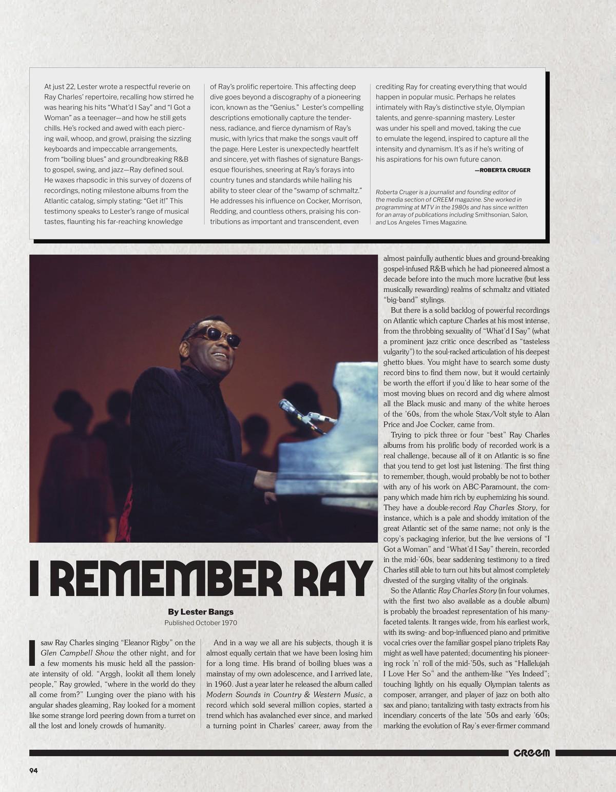 At just 22, Lester wrote a respectful reverie on Ray Charles’ repertoire, recalling how stirred he was hearing his hits “What’d I Say” and “I Got a Woman” as a teenager—and how he still gets chills. He’s rocked and awed with each piercing wail, whoop, and growl, praising the sizzling keyboards and impeccable arrangements, from “boiling blues” and groundbreaking R&B to gospel, swing, and jazz—Ray defined soul.