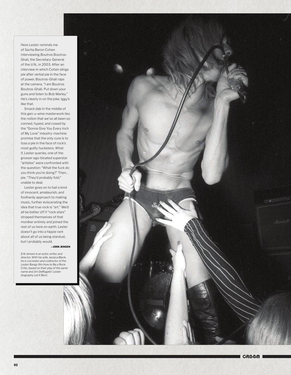 Here Lester reminds me of Sacha Baron Cohen interviewing Boutros BoutrosGhali, the Secretary-General of the U.N., in 2003. After an interview in which Cohen slings pie after verbal pie in the face of power, Boutros-Ghali raps at the camera, “I am Boutros Boutros-Ghali. Put down your guns and listen to Bob Marley." He’s clearly in on the joke. Iggy’s like that.