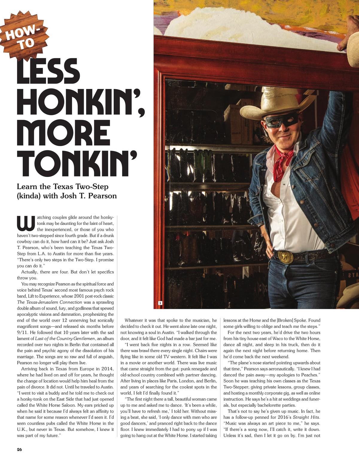 Watching couples glide around the honkytonk may be daunting for the faint of heart, the inexperienced, or those of you who haven’t two-stepped since fourth grade. But if a drunk cowboy can do it, how hard can it be? Just ask Josh T. Pearson, who’s been teaching the Texas Two-Step from L.A. to Austin for more than five years. “There’s only two steps in the Two-Step. I promise you can do it.”
