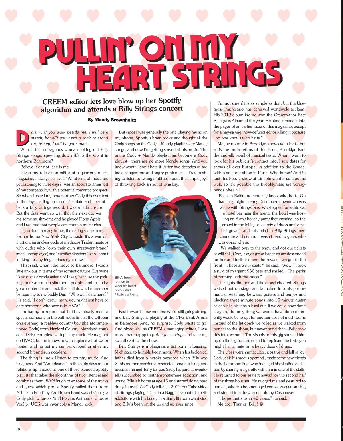 CREEM editor lets love blow up her Spotify algorithm and attends a Billy Strings concert.