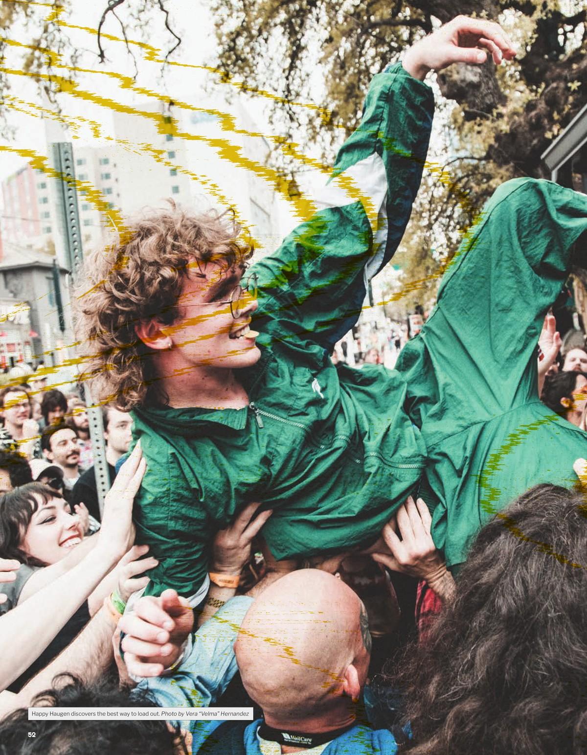 It’s 6:10 p.m. on Sixth Street in Austin during SXSW, and there are 600-plus on the street watching Nashville’s greatest underground punk export, Snooper. But the band’s performance isn’t sponsored by the U.S. Army, its giant green papiermâché mosquito isn’t bouncing around in a venue, and the band’s psychedelic video units built to look like stand-up arcade games aren’t connected to a stage. Instead, the units are plugged into hundreds of feet of extension cords placing the amps directly adjacent to the sidewalk. Punk style, just right out in the open. Is the band worried about being within earshot of more than a dozen cops? No, and if they were, they probably wouldn’t have set up directly in front of them. This is Snooper ina nutshell—fun, chaotic, dorky, rock ’n’ roll through and through, but more than anything else, totally and completely endearing. Even Austin’s finest let them finish their set uninterrupted, just watching along from the sidewalk, giggling to each other from underneath their cop-staches.