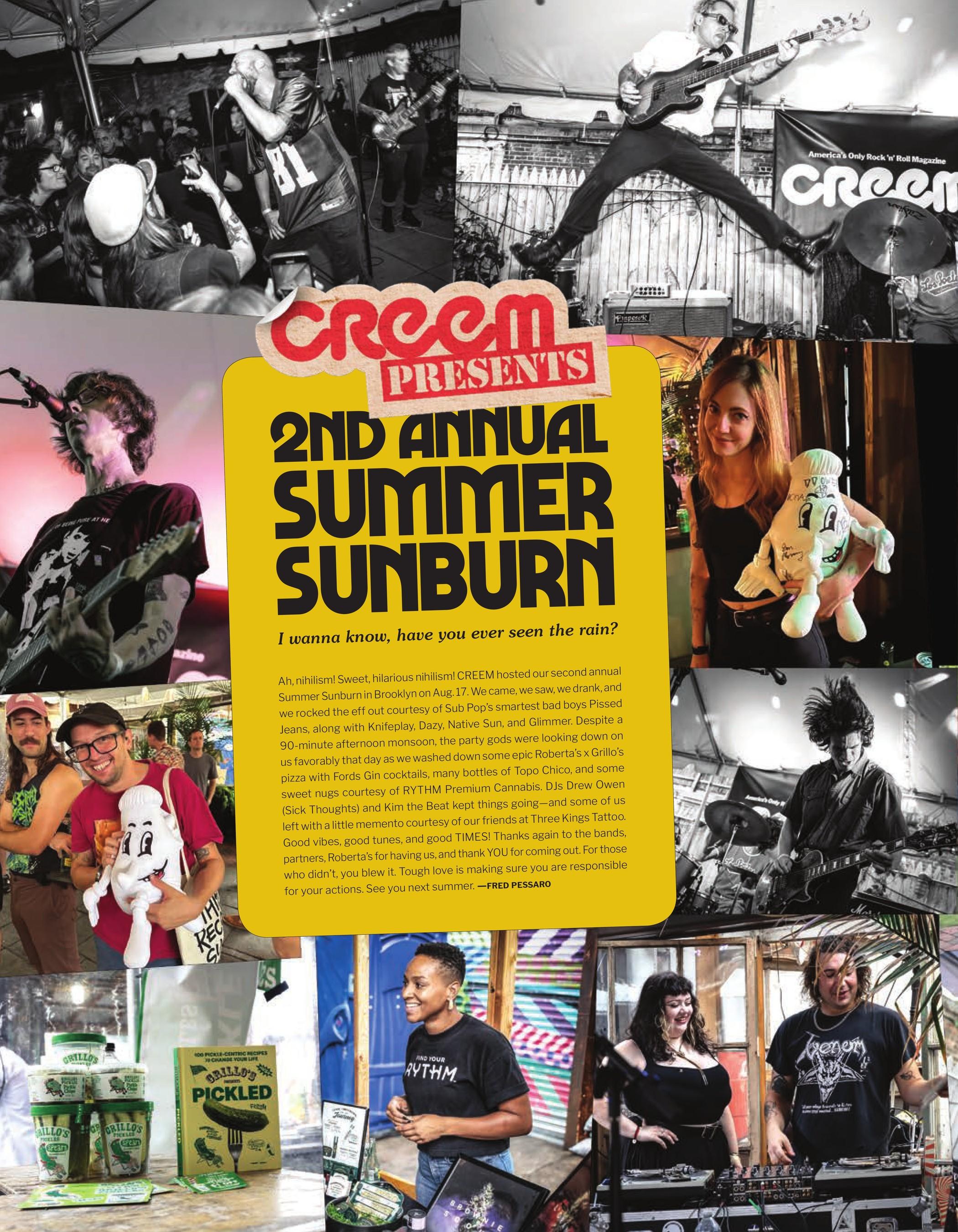 Ah, nihilism! Sweet, hilarious nihilism! CREEM hosted our second annual Summer Sunburn in Brooklyn on Aug. 17. We came, we saw, we drank, and we rocked the eff out courtesy of Sub Pop’s smartest bad boys Pissed Jeans, along with Knifeplay, Dazy, Native Sun, and Glimmer. Despite a 90-minute afternoon monsoon, the party gods were looking down on us favorably that day as we washed down some epic Roberta’s x Grillo’s pizza with Fords Gin cocktails, many bottles of Topo Chico, and some sweet nugs courtesy of RYTHM Premium Cannabis. DJs Drew Owen (Sick Thoughts) and Kim the Beat kept things going—and some of us left with a little memento courtesy of our friends at Three Kings Tattoo. Good vibes, good tunes, and good TIMES! Thanks again to the bands, partners, Roberta’s for having us, and thank YOU for coming out. For those who didn’t, you blew it. Tough love is making sure you are responsible for your actions. See you next summer.