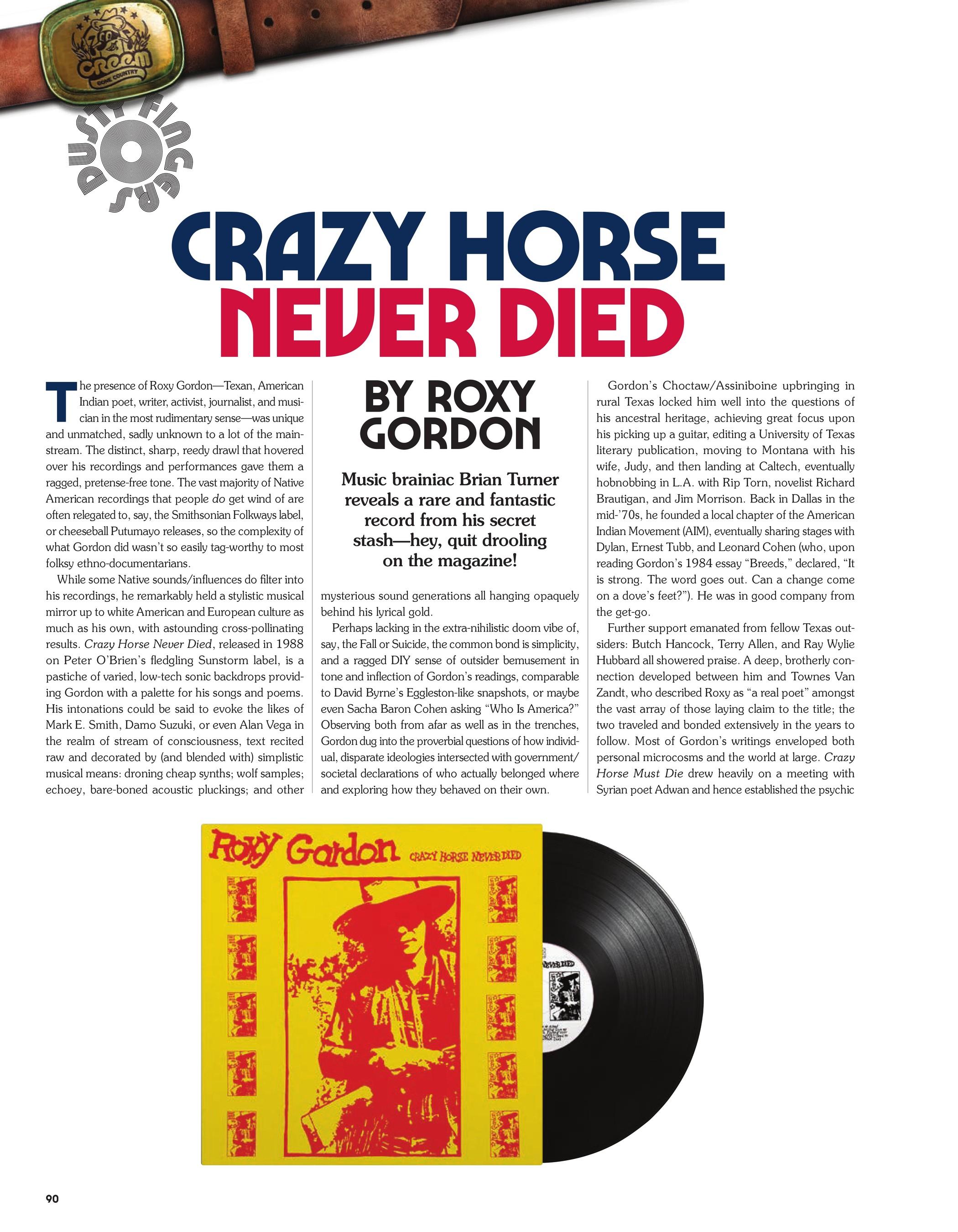 While some Native sounds/influences do filter into his recordings, he remarkably held a stylistic musical mirror up to white American and European culture as much as his own, with astounding cross-pollinating results. Crazy Horse Neuer Died, released in 1988 on Peter O’Brien’s fledgling Sunstorm label, is a pastiche of varied, low-tech sonic backdrops providing Gordon with a palette for his songs and poems. His intonations could be said to evoke the likes of