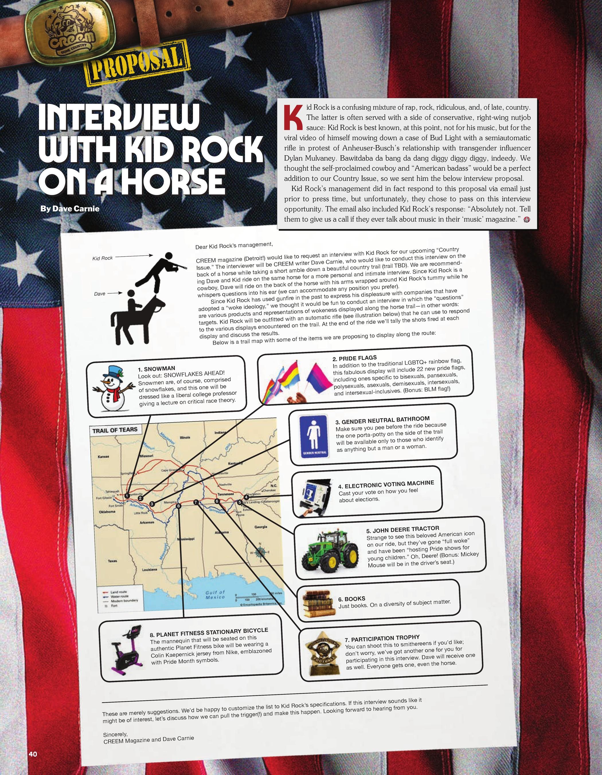 Dear Kid Rock's management, CREEM Magazine (Detroit) would like to request an interview with Kid Rock for our upcoming "Country Issue." The interviewer will be CREEM writer Dave Carnie, who would like to conduct this interview on the back of a horse...