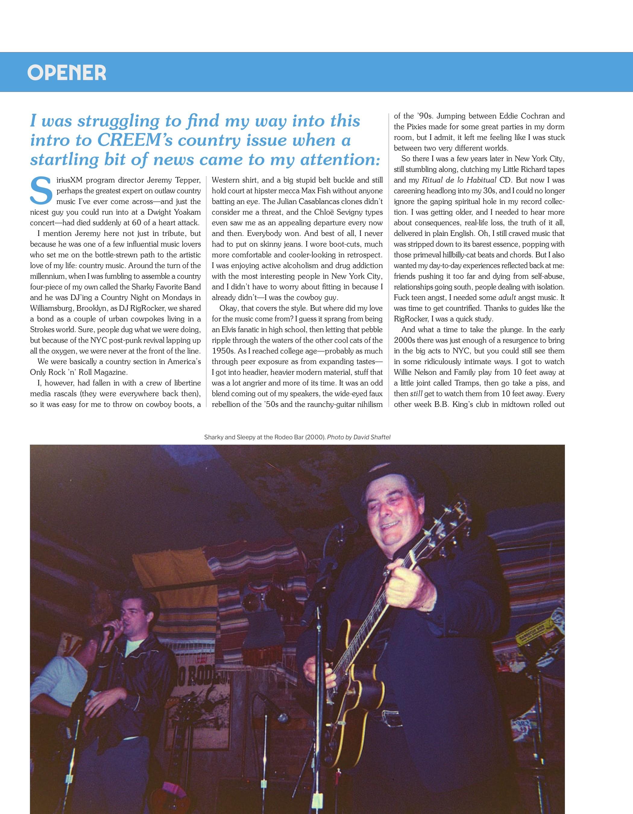 I mention Jeremy here not just in tribute, but because he was one of a few influential music lovers who set me on the bottle-strewn path to the artistic love of my life: country music. Around the turn of the millennium, when I was fumbling to assemble a country four-piece of my own called the Sharky Favorite Band and he was DJ’ing a Country Night on Mondays in Williamsburg, Brooklyn, as DJ RigRocker, we shared a bond as a couple of urban cowpokes living in a Strokes world. Sure, people dug what we were doing, but because of the NYC post-punk revival lapping up all the oxygen, we were never at the front of the line.
