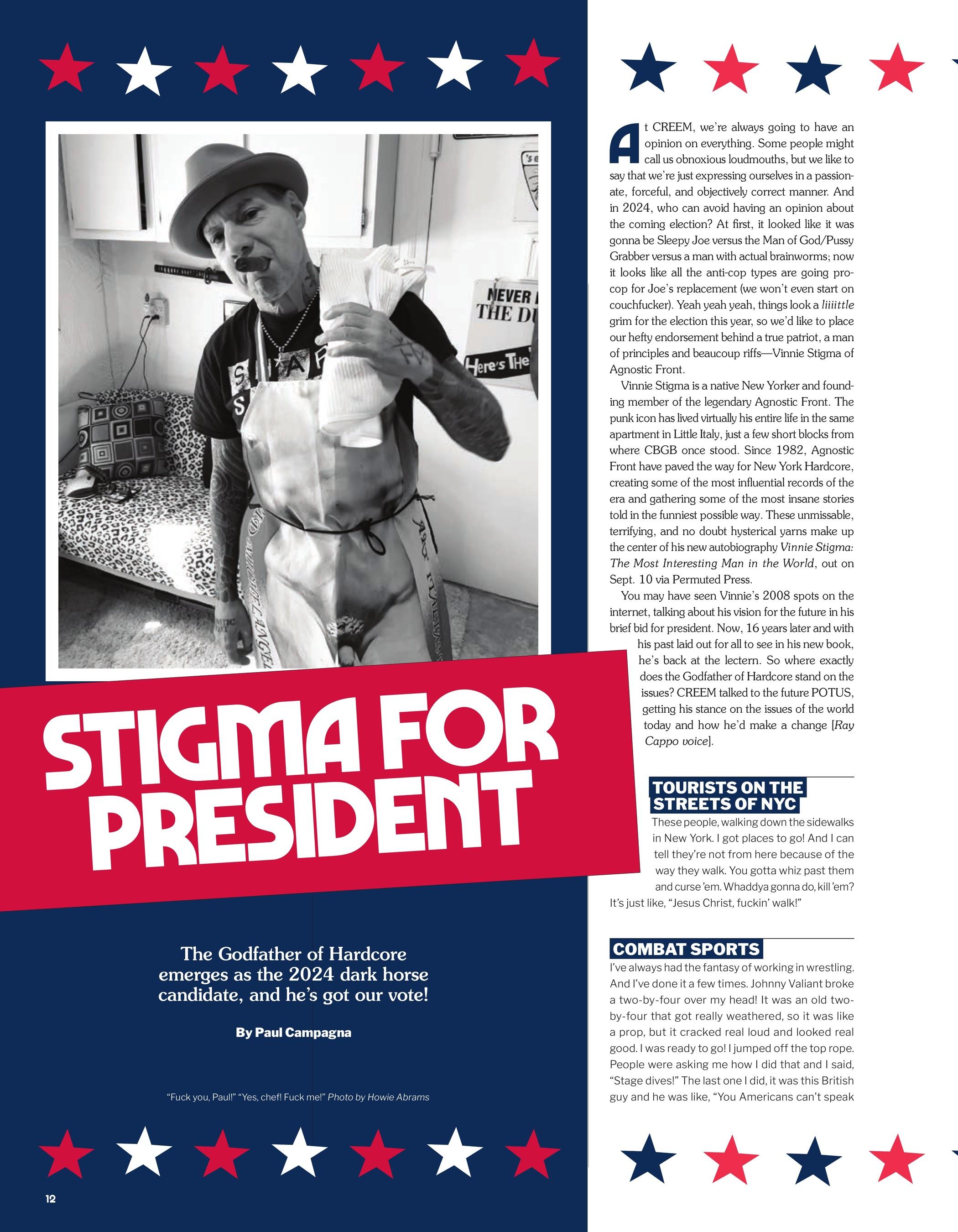 At CREEM, we’re always going to have an opinion on everything. Some people might call us obnoxious loudmouths, but we like to say that we’re just expressing ourselves in a passionate, forceful, and objectively correct manner. And in 2024, who can avoid having an opinion about the coming election? At first, it looked like it was gonna be Sleepy Joe versus the Man of God/Pussy Grabber versus a man with actual brainworms; now it looks like all the anti-cop types are going procop for Joe’s replacement (we won’t even start on couchfucker). Yeah yeah yeah, things look a liiiittle grim for the election this year, so we’d like to place our hefty endorsement behind a true patriot, a man of principles and beaucoup riffs—Vinnie Stigma of Agnostic Front.