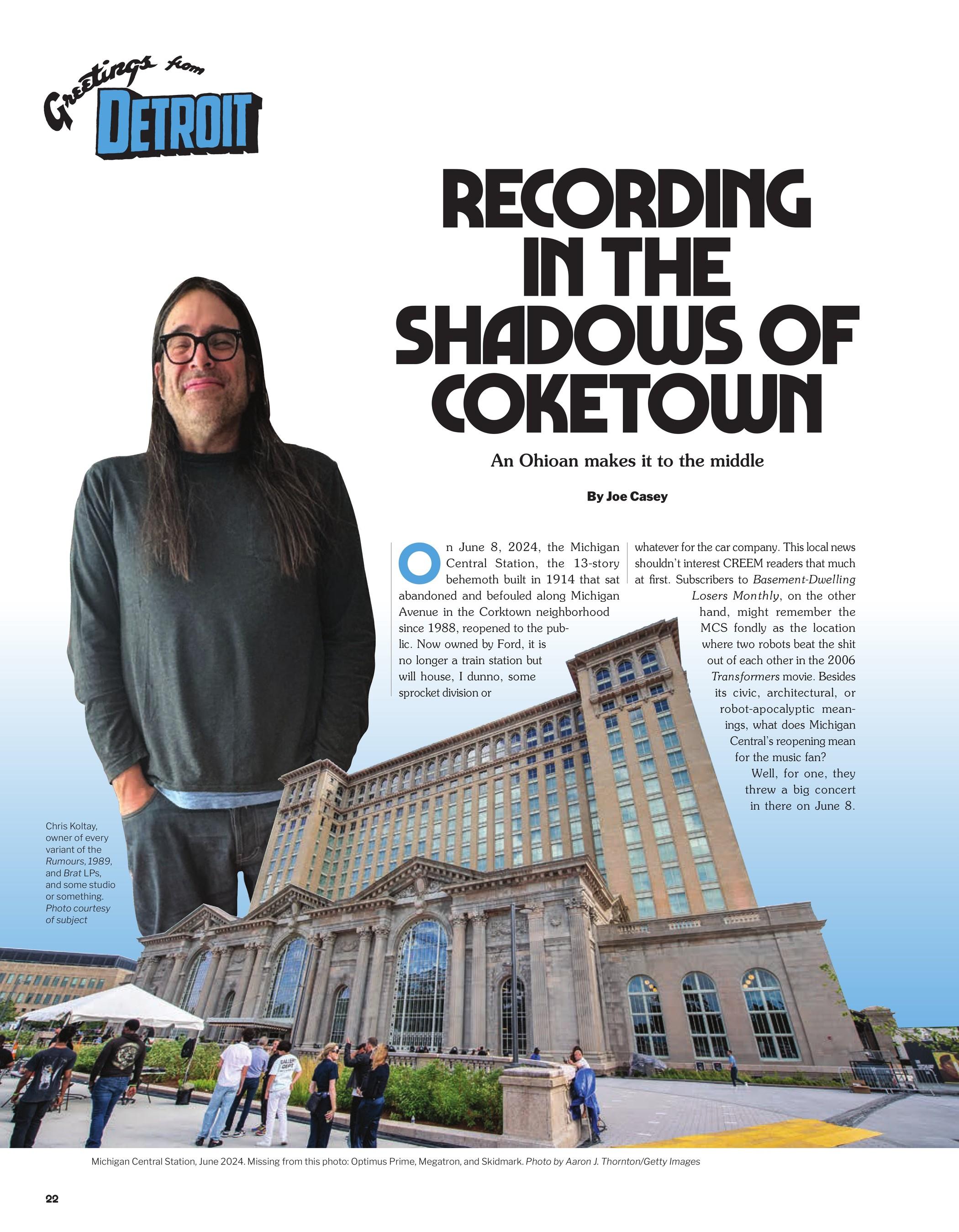 On June 8, 2024, the Michigan Central Station, the 13-story behemoth built in 1914 that sat abandoned and befouled along Michigan Avenue in the Corktown neighborhood since 1988, reopened to the public. Now owned by Ford, it is no longer a train station but will house, I dunno, some sprocket division or whatever for the car company. This local news shouldn’t interest CREEM readers that much at first. Subscribers to Basement-Dwelling Losers Monthly, on the other hand, might remember the MCS fondly as the location where two robots beat the shit out of each other in the 2006 Transformers movie. Besides its civic, architectural, or robot-apocalyptic meanings, what does Michigan Central's reopening mean for the music fan?