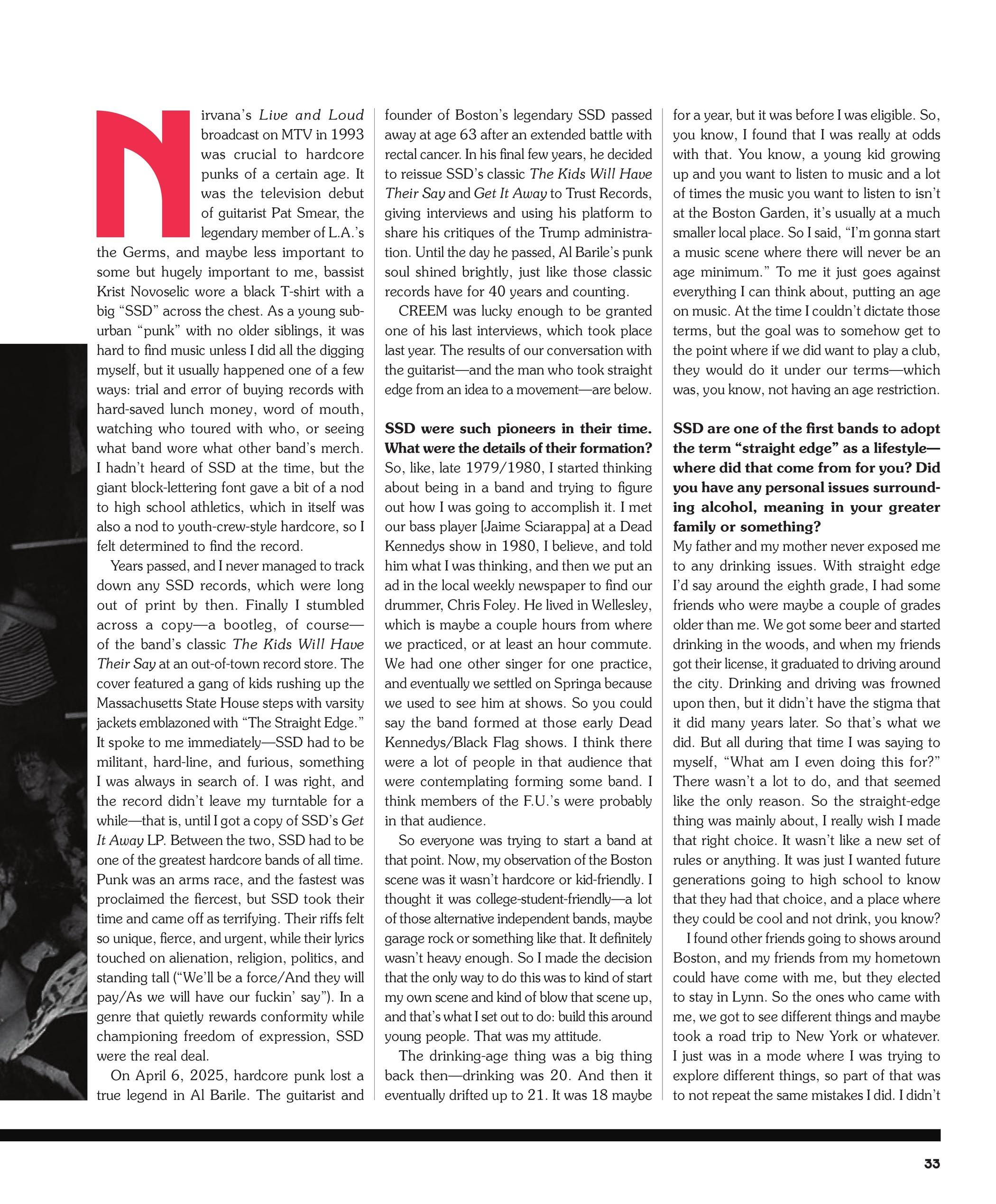Nirvana’s Live and Loud broadcast on MTV in 1993 was crucial to hardcore punks of a certain age. It was the television debut of guitarist Pat Smear, the legendary member of L.A.’s the Germs, and maybe less important to some but hugely important to me, bassist Krist Novoselic wore a black T-shirt with a big “SSD” across the chest. As a young suburban “punk” with no older siblings, it was hard to find music unless I did all the digging myself, but it usually happened one of a few ways: trial and error of buying records with hard-saved lunch money, word of mouth, watching who toured with who, or seeing what band wore what other band’s merch. I hadn’t heard of SSD at the time, but the giant block-lettering font gave a bit of a nod to high school athletics, which in itself was also a nod to youth-crew-style hardcore, so I felt determined to find the record.