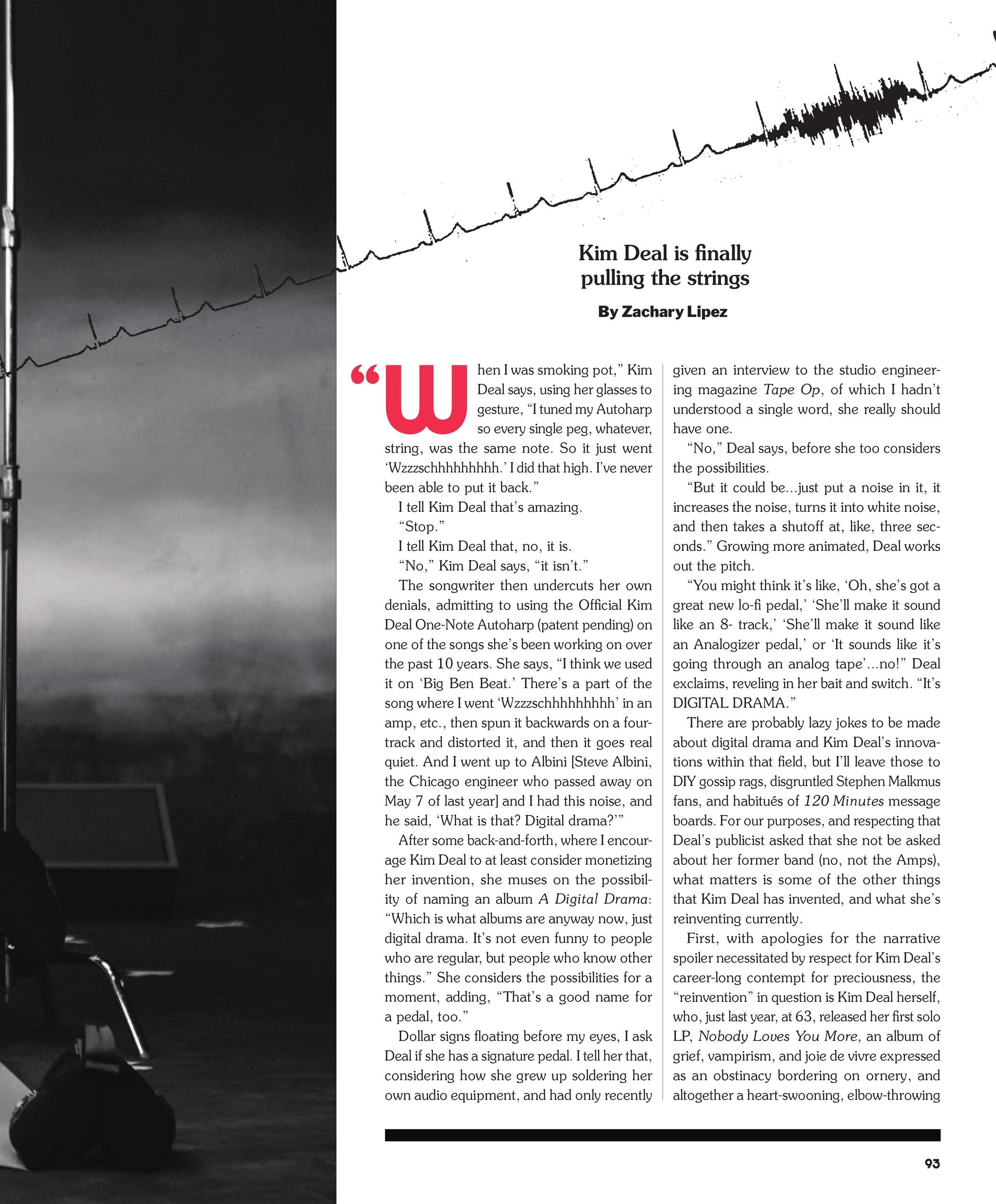 The songwriter then undercuts her own denials, admitting to using the Official Kim Deal One-Note Autoharp (patent pending) on one of the songs she’s been working on over the past 10 years. She says, “I think we used it on ‘Big Ben Beat.’ There’s a part of the song where I went ‘Wzzzschhhhhhhhh’ in an amp, etc., then spun it backwards on a fourtrack and distorted it, and then it goes real quiet. And I went up to Albini [Steve Albini, the Chicago engineer who passed away on May 7 of last year] and I had this noise, and he said, ‘What is that? Digital drama?'"