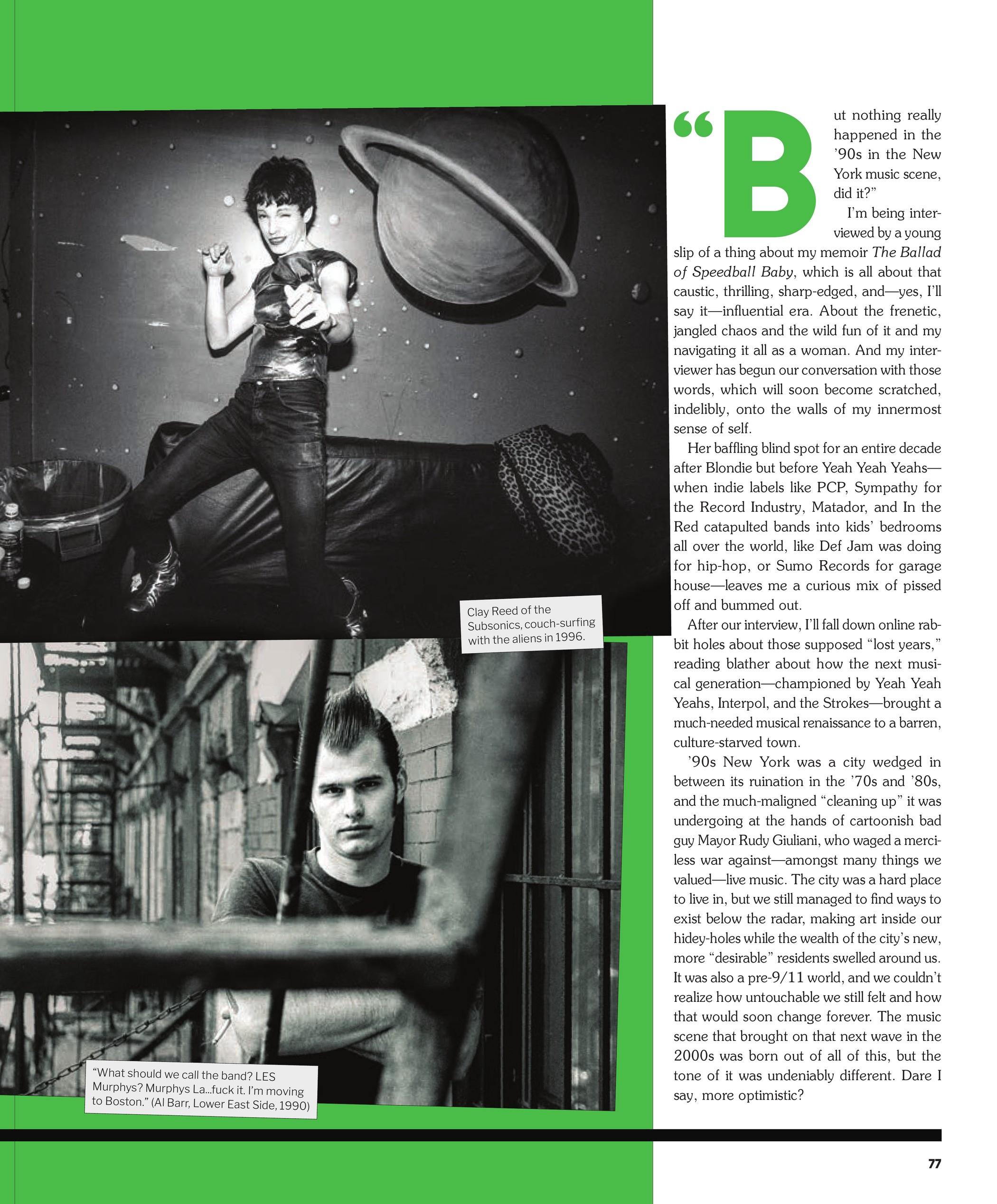 I’m being interviewed by a young slip of a thing about my memoir The Ballad of Speedball Baby, which is all about that caustic, thrilling, sharp-edged, and—yes, I’ll say it—influential era. About the frenetic, jangled chaos and the wild fun of it and my navigating it all as a woman. And my interviewer has begun our conversation with those words, which will soon become scratched, indelibly, onto the walls of my innermost sense of self.