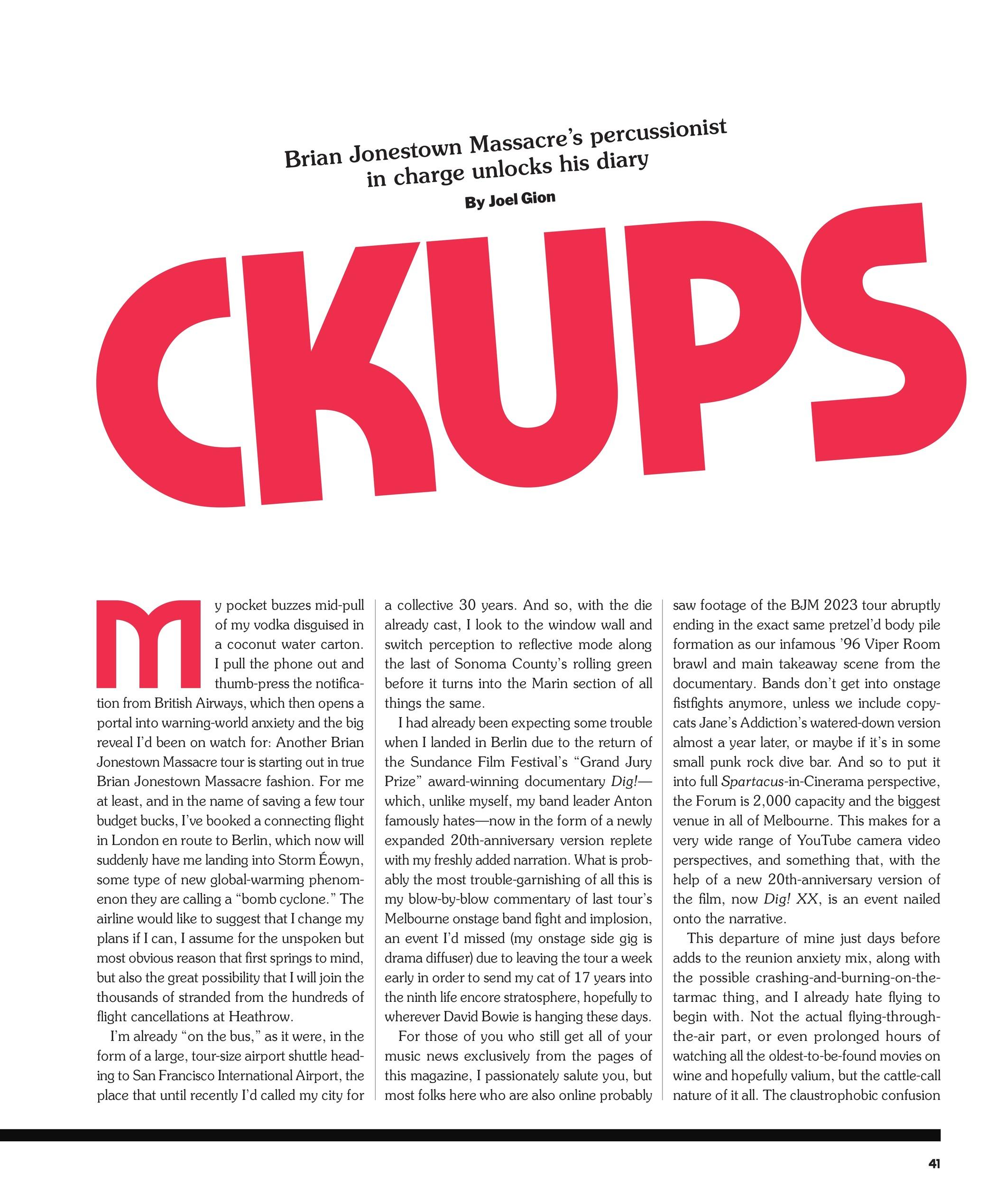 My pocket buzzes mid-pull of my vodka disguised in a coconut water carton. I pull the phone out and thumb-press the notification from British Airways, which then opens a portal into warning-world anxiety and the big reveal I’d been on watch for: Another Brian Jonestown Massacre tour is starting out in true Brian Jonestown Massacre fashion. For me at least, and in the name of saving a few tour budget bucks, I’ve booked a connecting flight in London en route to Berlin, which now will suddenly have me landing into Storm Éowyn, some type of new global-warming phenomenon they are calling a “bomb cyclone.” The airline would like to suggest that I change my plans if I can, I assume for the unspoken but most obvious reason that first springs to mind, but also the great possibility that I will join the thousands of stranded from the hundreds of flight cancellations at Heathrow.