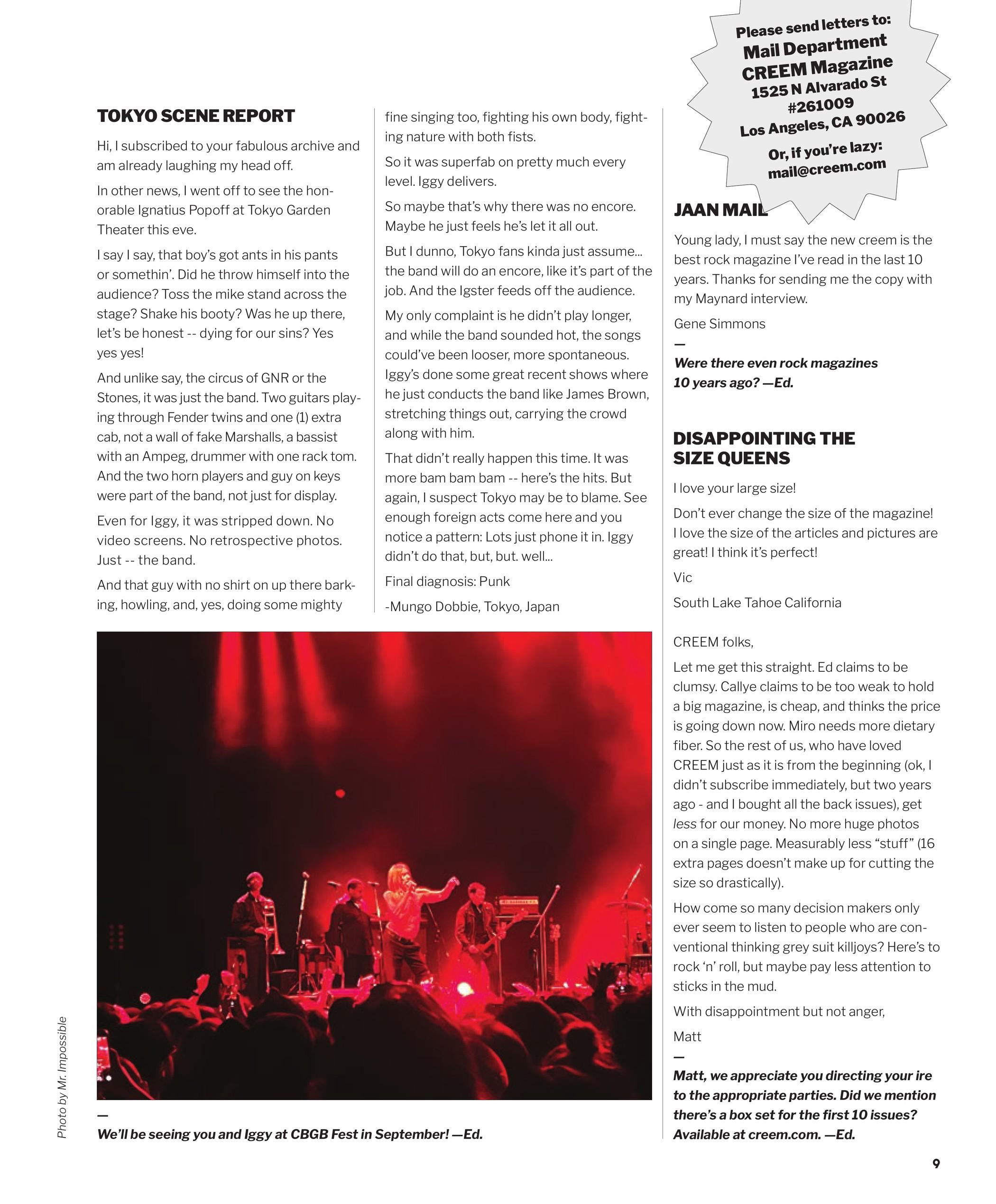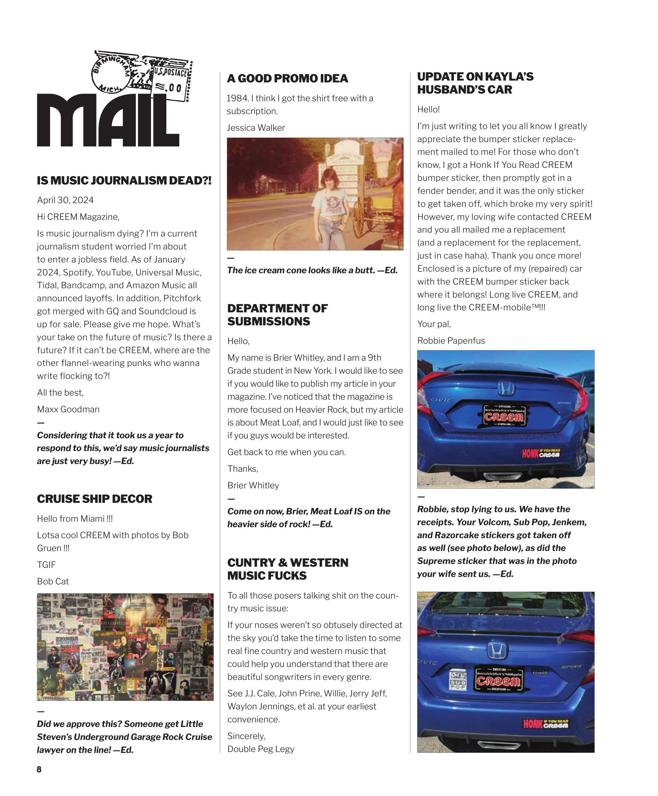 Please send letters to: Mail Department 1525 N Alvarado St #261009 Los Angeles, CA 90026 Or, if you’re lazy: mail@creem.com