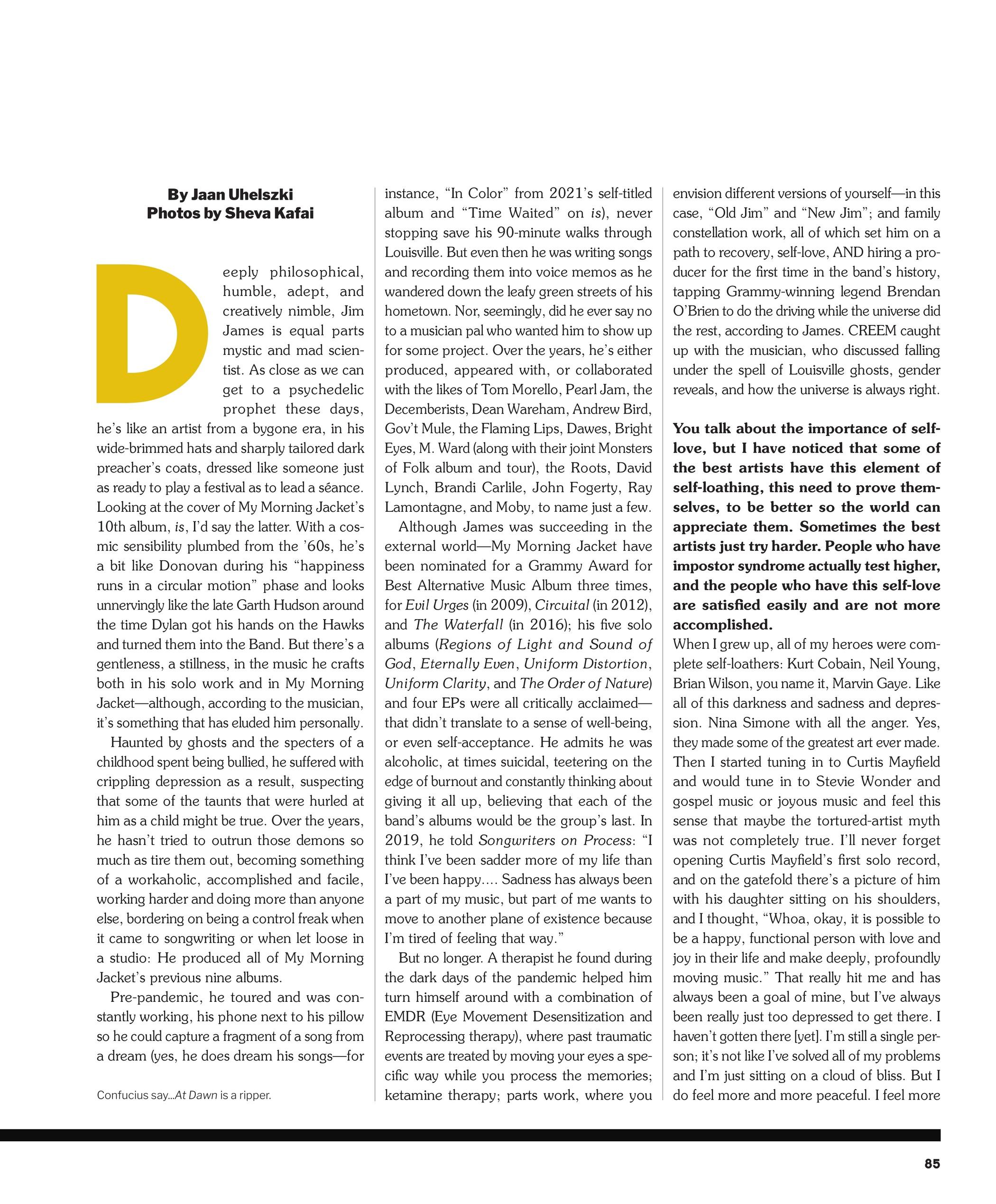 Deeply philosophical, humble, adept, and creatively nimble, Jim James is equal parts mystic and mad scientist. As close as we can get to a psychedelic prophet these days, he’s like an artist from a bygone era, in his wide-brimmed hats and sharply tailored dark preacher’s coats, dressed like someone just as ready to play a festival as to lead a séance. Looking at the cover of My Morning Jacket’s 10th album, is, I’d say the latter. With a cosmic sensibility plumbed from the ’60s, he’s a bit like Donovan during his “happiness runs in a circular motion” phase and looks unnervingly like the late Garth Hudson around the time Dylan got his hands on the Hawks and turned them into the Band. But there’s a gentleness, a stillness, in the music he crafts both in his solo work and in My Morning Jacket—although, according to the musician, it’s something that has eluded him personally.