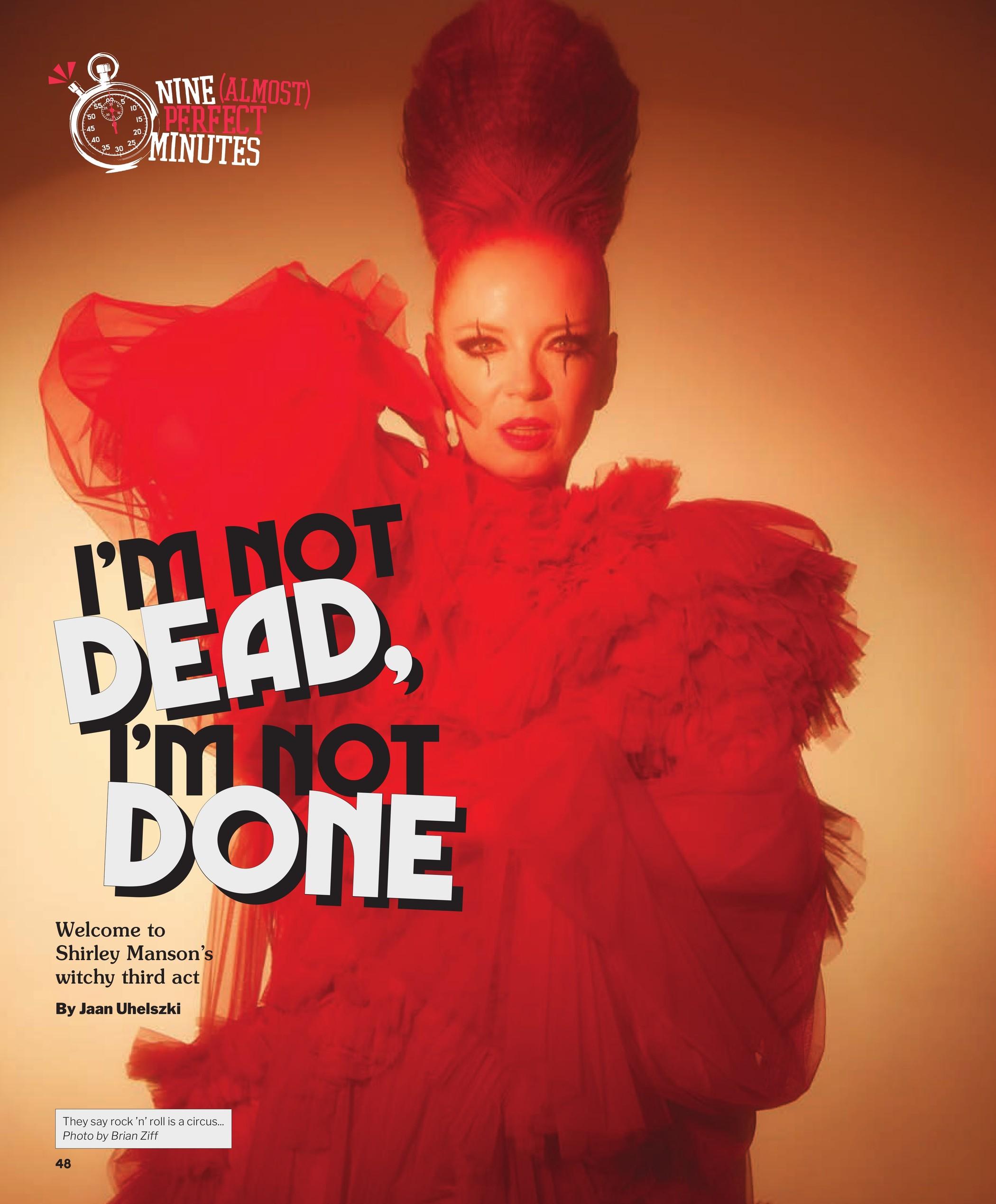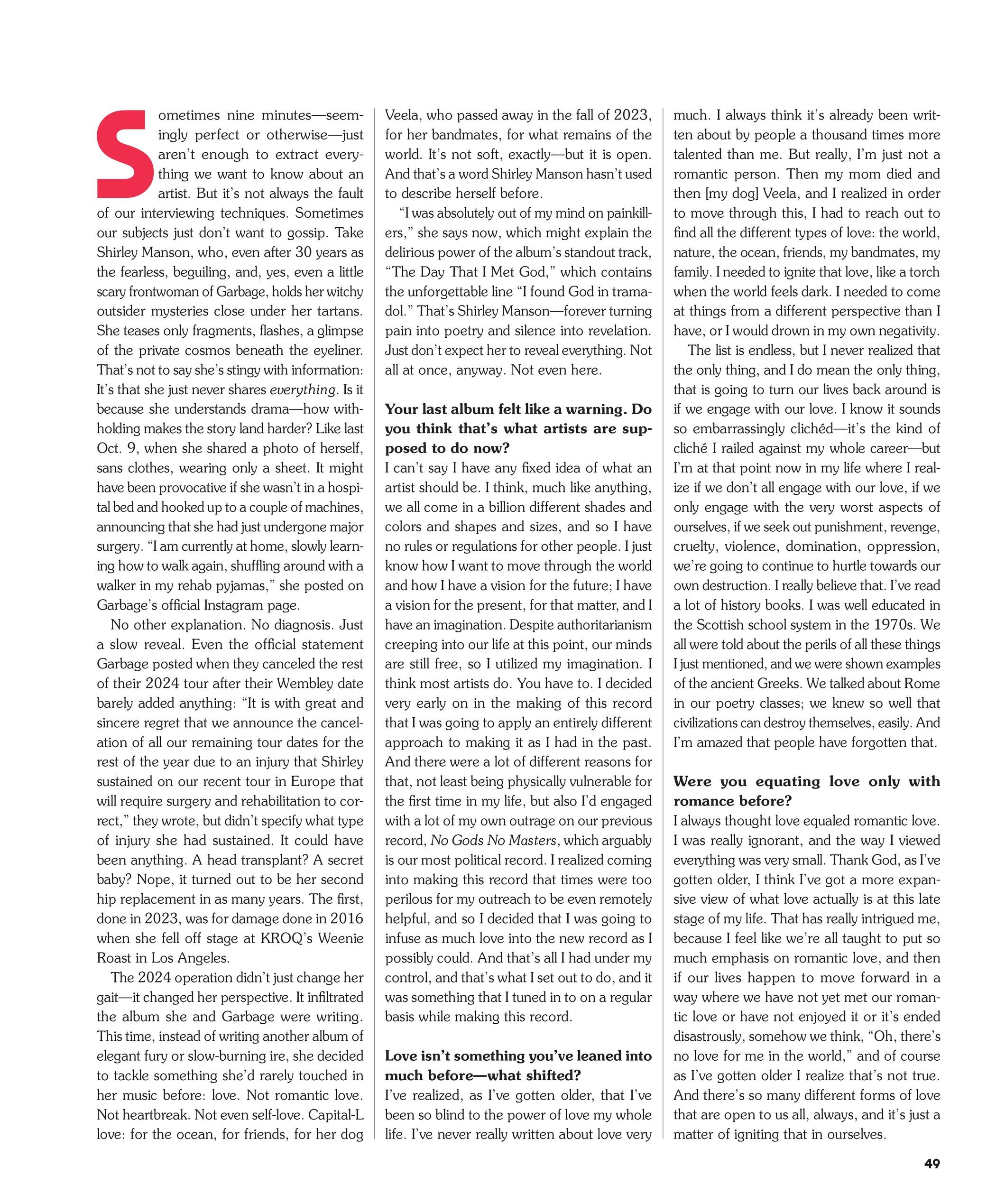 Sometimes nine minutes—seemingly perfect or otherwise—just aren’t enough to extract everything we want to know about an artist. But it’s not always the fault of our interviewing techniques. Sometimes our subjects just don’t want to gossip. Take Shirley Manson, who, even after 30 years as the fearless, beguiling, and, yes, even a little scary frontwoman of Garbage, holds her witchy outsider mysteries close under her tartans. She teases only fragments, flashes, a glimpse of the private cosmos beneath the eyeliner. That’s not to say she’s stingy with information: It’s that she just never shares everything. Is it because she understands drama—how with-holding makes the story land harder? Like last Oct. 9, when she shared a photo of herself, sans clothes, wearing only a sheet. It might have been provocative if she wasn’t in a hospital bed and hooked up to a couple of machines, announcing that she had just undergone major surgery. “I am currently at home, slowly learning how to walk again, shuffling around with a walker in my rehab pyjamas,” she posted on Garbage’s official Instagram page.