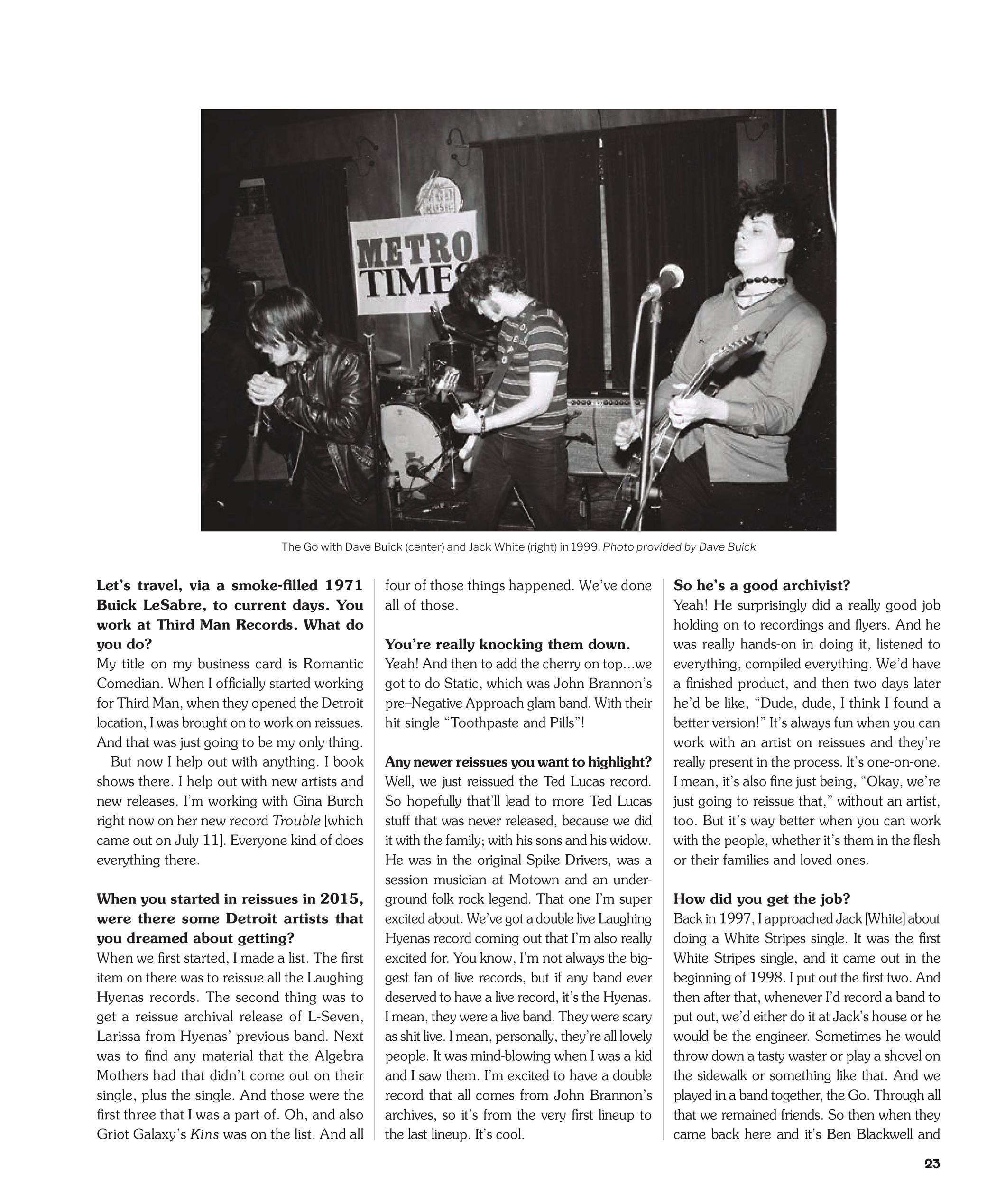 For this issue I had a quick, one-beer conversation with local bon vivant Dave Buick over at Motor City Brewing Works during a summer storm. He was coming off the high of recently attending Jack White’s 50th birthday (my invite was lost in the mail) and the excitement of an impending trip to London, where Third Man was throwing a release party for Gina Birch’s new record Trouble. There’s nothing like chatting with me to even a fella out.