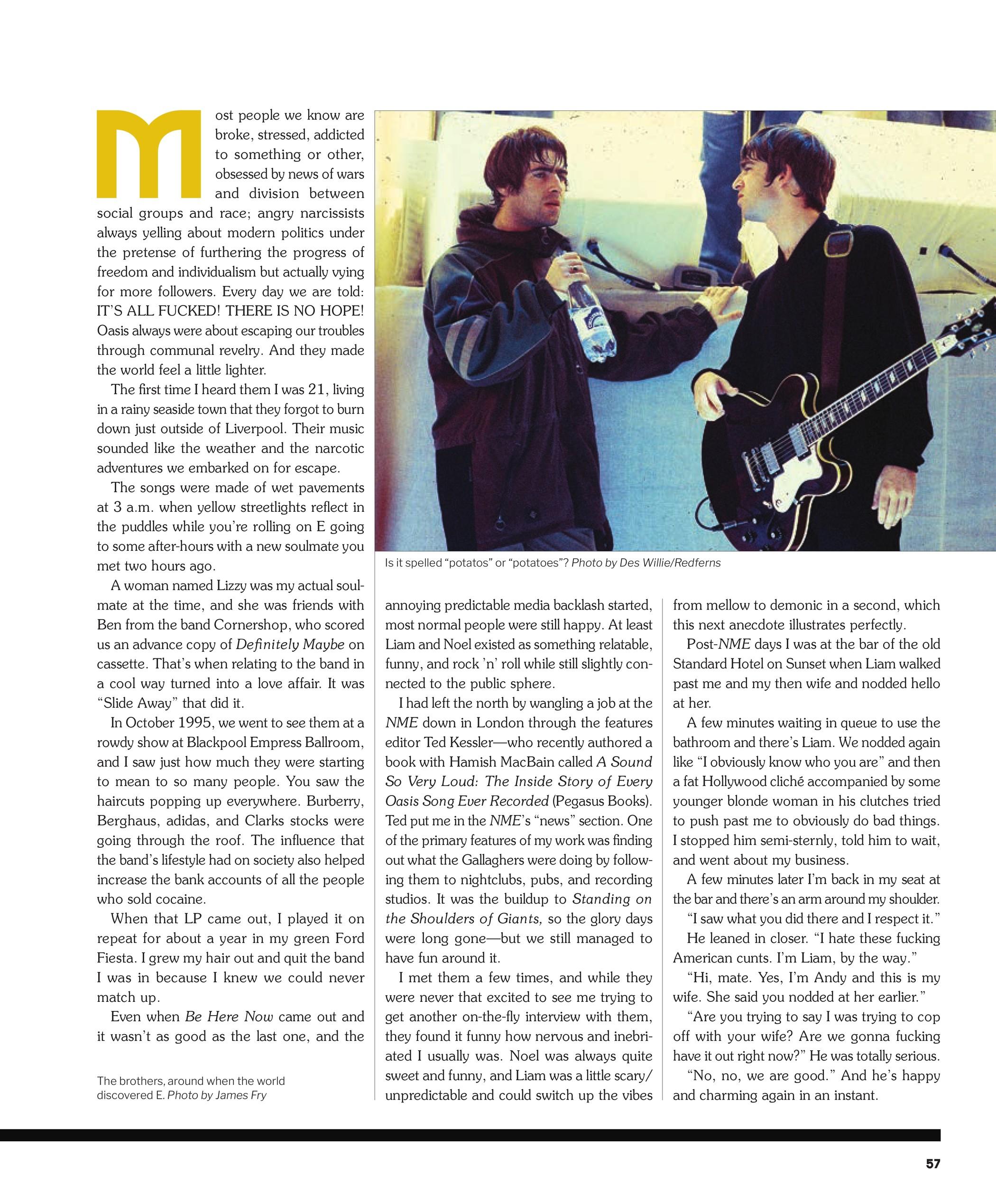 Most people we know are broke, stressed, addicted to something or other, obsessed by news of wars and division between social groups and race; angry narcissists always yelling about modern politics under the pretense of furthering the progress of freedom and individualism but actually vying for more followers. Every day we are told: IT’S ALL FUCKED! THERE IS NO HOPE! Oasis always were about escaping our troubles through communal revelry. And they made the world feel a little lighter.