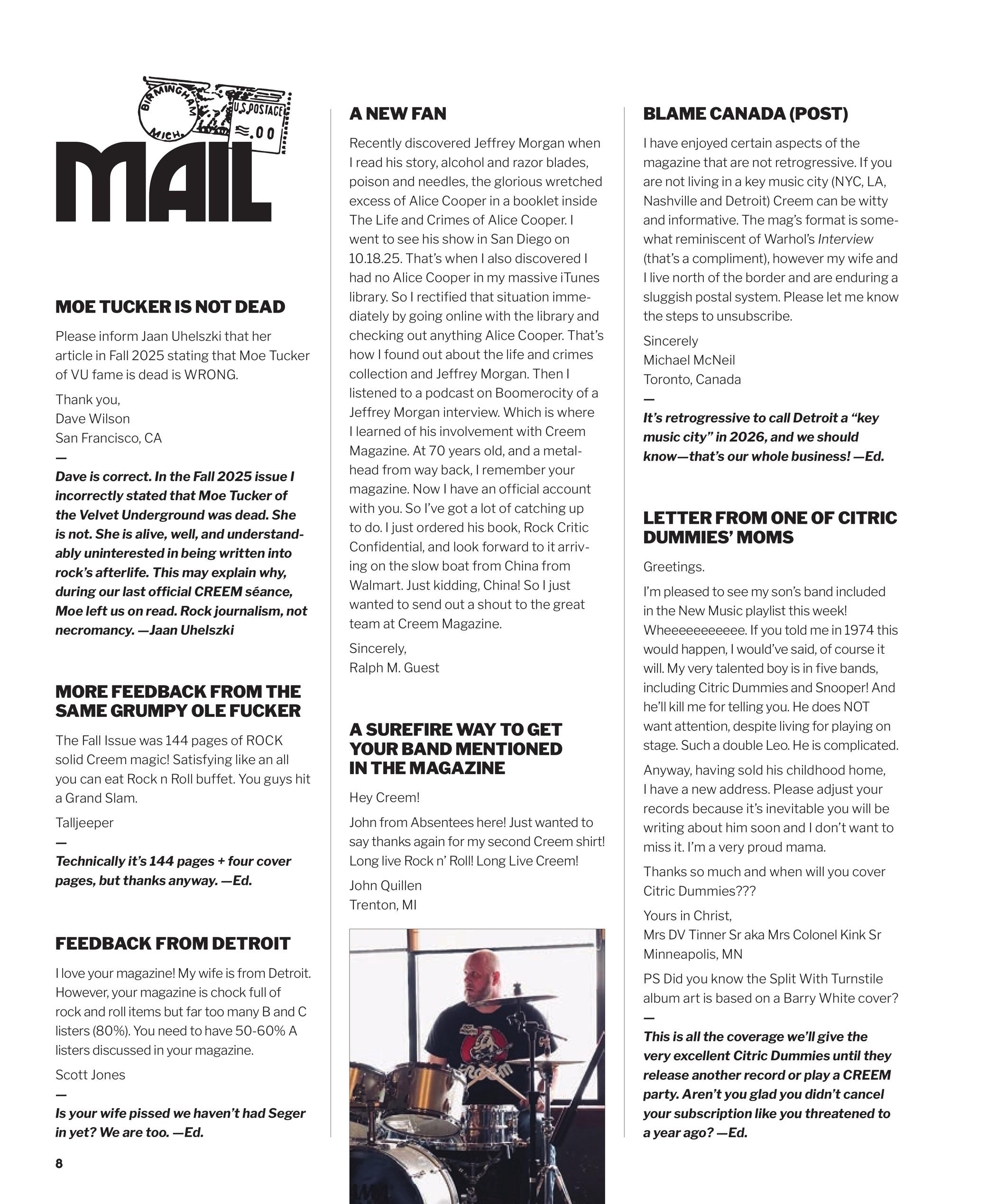 Please send letters to: Mail Department CREEM Magazine 1525 N Alvarado St #261009 Los Angeles, CA 90026 Or, if you’re lazy: mail@creem.com