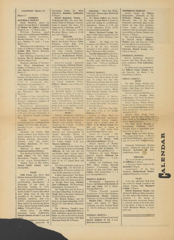 CALENDAR ߞ March 1-14 March 1-7 EXHIBITS SATURDAY, MARCH 1 David Driesbach, prints on exhibit through March 7. University of Windsor Art Gallery, University Centre 9 a.m. — 11:30 p.m. daily. William Fanning, small watercolors and drawings.