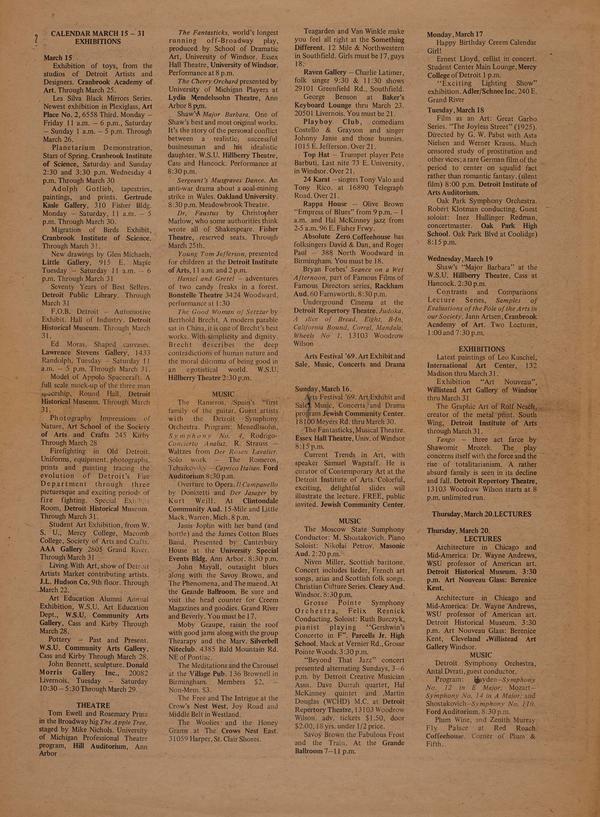 March 15 , Exhibition of toys, from the studios of Detroit Artists and Designers. Cranbrook Academy of Art. Through March 25. Les Silva Black Mirrors Series. Newest exhibition in Plexiglass, Art Place No. 2,6558 Third. Monday — Friday. 11 a.m. — 6 p.m., Saturday — Sunday 1 a.m. — 5 p.m. Through March 26.