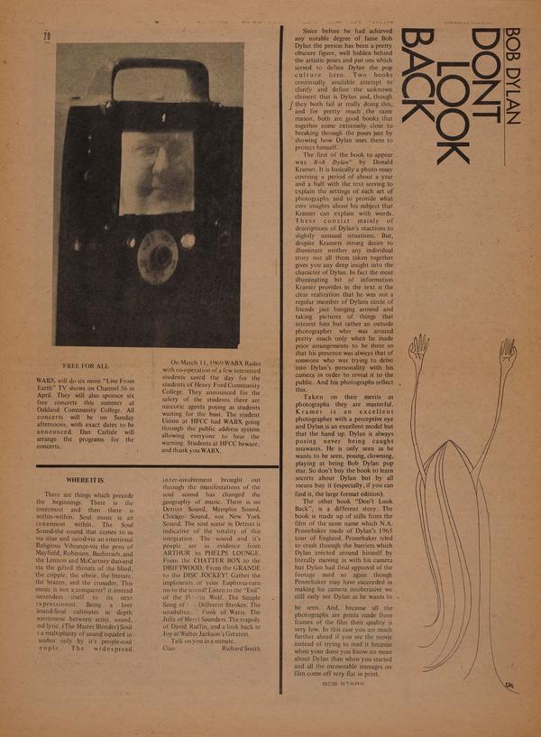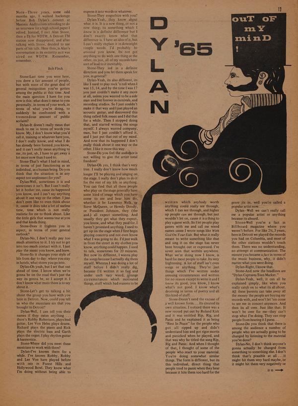 Note—Three years, some odd months ago, I walked backstage before Bob Dylan's concert at Masonic Auditorium intending to do an interview for a high school paper I edited. Instead, I met Alan Stone, then a Dj for WDTM, A Detroit FM station now disappeared, and after talking with Stone, decided to use parts of his talk.