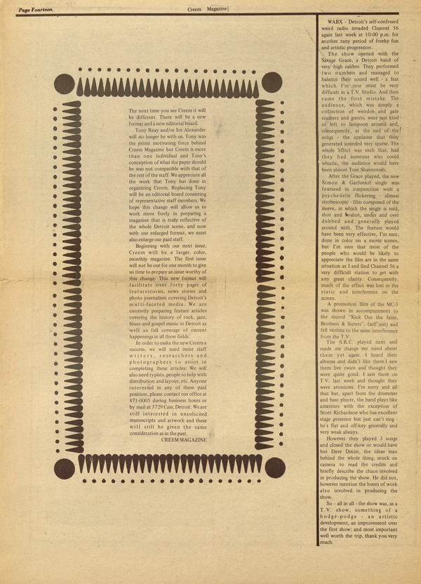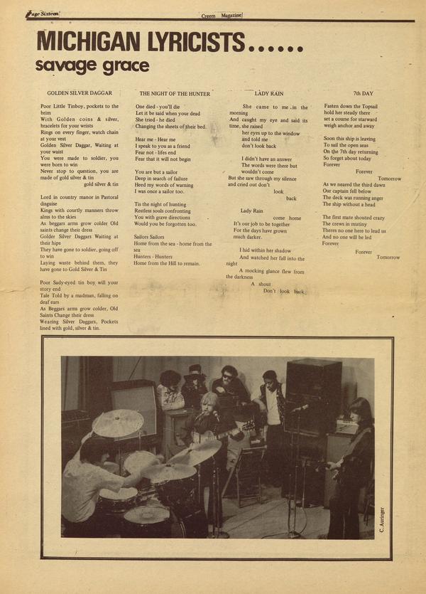 WABX - Detroit’s self-confessed weird radio invaded Channel 56 again last week at 10:00 p.m. for another zany period of freeky fun and artistic progression. The show opened with the Savage Grace, a Detroit band of very high calibre. They performed two numbers and managed to balance their sound well - a feat which I’m sure must be very difficult in a T.V. Studio.