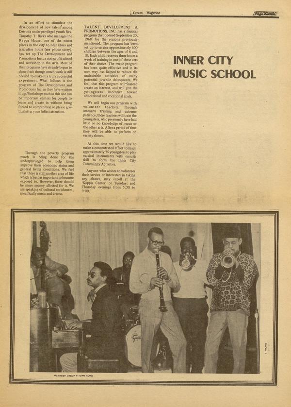 In an effort to stimulate the development of new talent among Detroits under privileged youth Rev. Timothy T. Hicks who manages the Rappa House, one of the nicest places in the city to hear blues and jazz after hours (see photo story), has set up The Development and Promotions Inc., a non-profit school and workshop in the Arts.