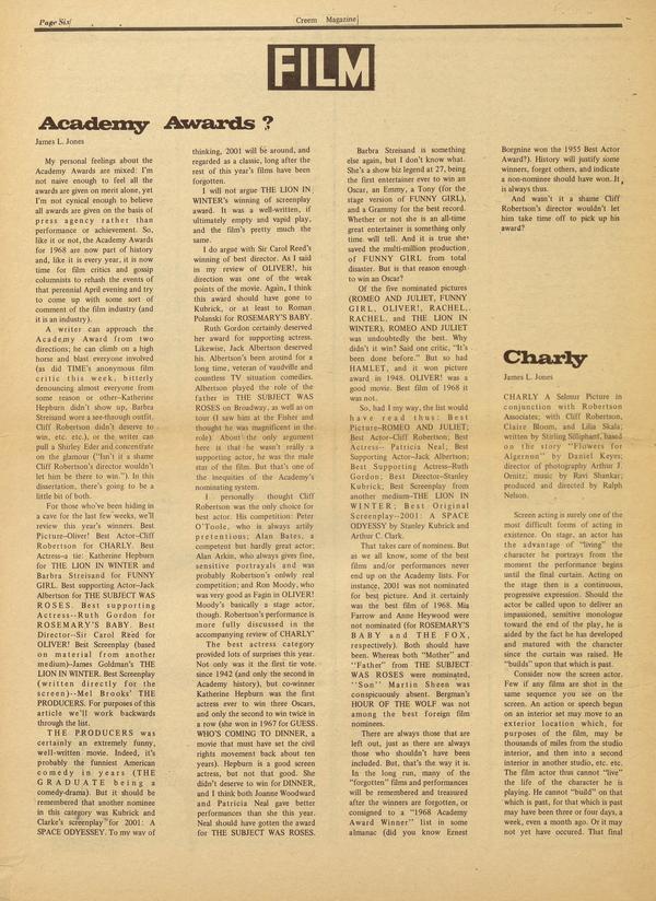 CHARLY A Selmur Picture in conjunction with Robertson Associates; with Cliff Robertson, Claire Bloom, and Lilia Skala; written by Stirling Silliphant, based on the story “Flowers for Algernon” by Daniel Keyes; director of photography Arthur J. Ornitz; music by Ravi Shankar; produced and directed by Ralph Nelson.