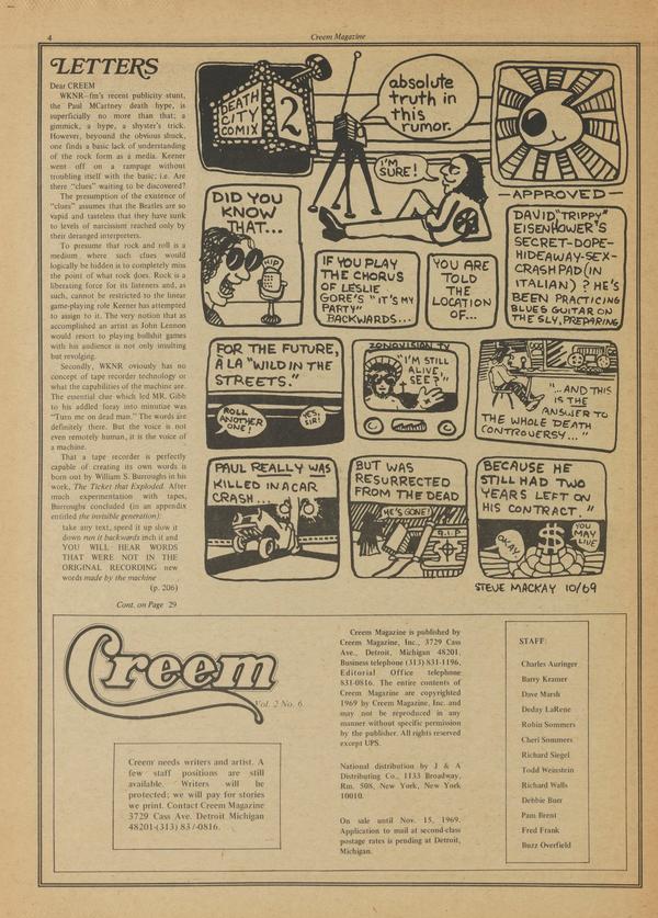 Dear CREEM WKNR—fm’s recent publicity stunt, the Paul MCartney death hype, is superficially no more than that; a gimmick, a hype, a shyster’s trick. However, beyound the obvious shuck, one finds a basic lack of understanding of the rock form as a media.