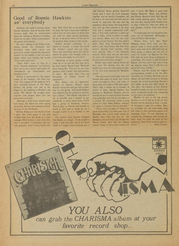 Suddenly the wold is hearing about Ronnie Hawkins. And all because John Lennon made him an international figure by staying at Ronnie’s Canadian home for ten days. Never underestimate the power of the Beatle. Wewere talking in his living room, sitting beside his Christmas tree decorated with white doves and green-iced cookies shaped like the peace symbol.