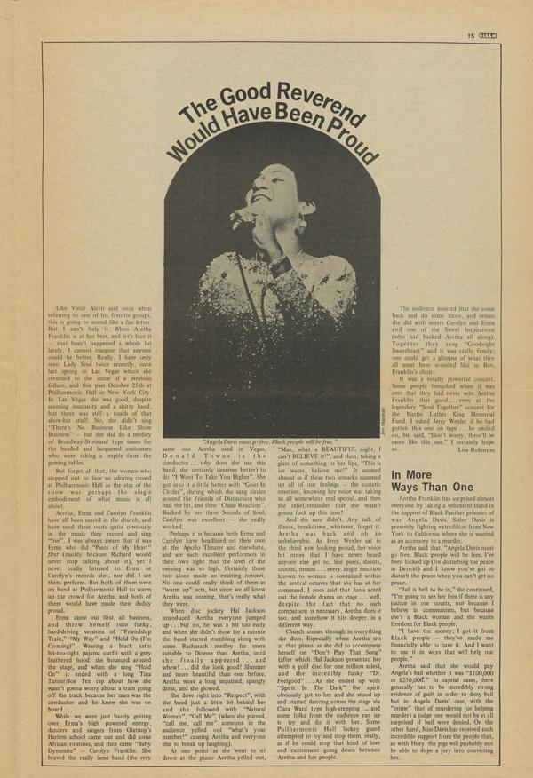 Aretha Franklin has surprised almost everyone by taking a vehement stand in the support of Black Panther prisoner of war Angela Davis. Sister Davis is presently fighting extradition from New York to California where she is wanted as an accessory to a murder.