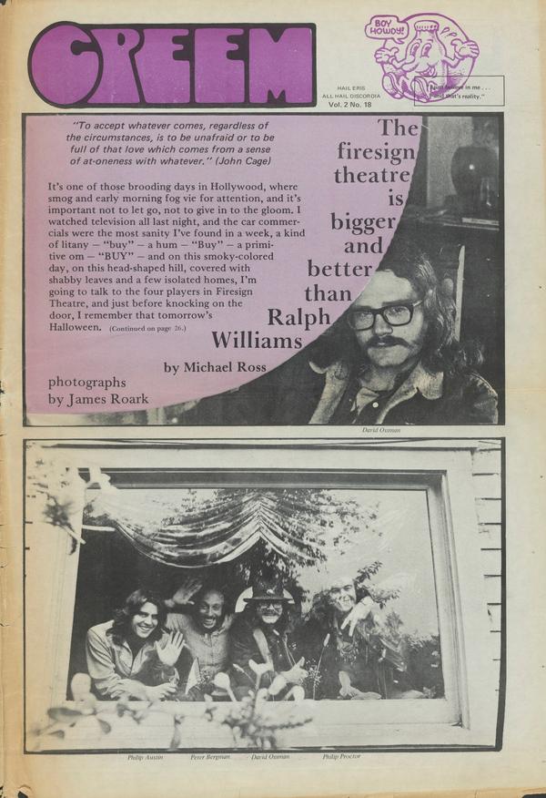 It’s one of those brooding days in Hollywood, where smog and early morning fog vie for attention, and it’s important not to let go, not to give in to the gloom. I watched television all last night, and the car commercials were the most sanity I’ve found in a week, a kind of litany — “buy” — a hum — “Buy” — a primitive om - “BUY” - and on this smoky-colored day, on this head-shaped hill, covered with shabby leaves and a few isolated homes, I’m going to talk to the four players in Firesign Theatre, and just before knocking on the door, I remember that tomorrow’s Halloween.