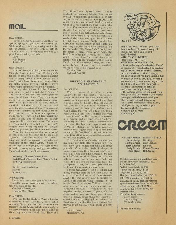 Dear CREEM: I’m from Detroit, moved to Seattle a year ago last spring and got a job as a mailcarrier. While working this week, sorting mail to be sent to Alaska, I ran into CREEM with R. Crumb’s cover and remembered some of you guys. Please send a year’s sub.