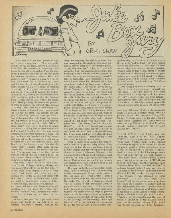It’s Bob Dylan month! Time for the first annual Bob Dylan Revival. “Just like the blues,” as Barry Kramer put it. Here ya go: new, mind boggling single (about George Jackson?!) new album (Bob Dylan’s Greatest Hits, Volume Two) maybe a movie and record of Bangla Desh, and Tony Scaduto’s supposedly definitive biography about to appear.