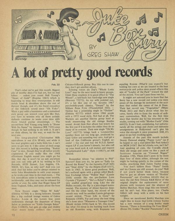 That’s what we’ve got this month. Biggest pile of worthy discs I’ve had yet, but no real killers — unless you count Neil Young’s “Heart of Gold” (Reprise 1065) which is beginning to wear thru overexposure. It still stands head & shoulders above the rest of Harvest though, and it’s the finest evocation of the folkrock sound since “Oh Yoko”.